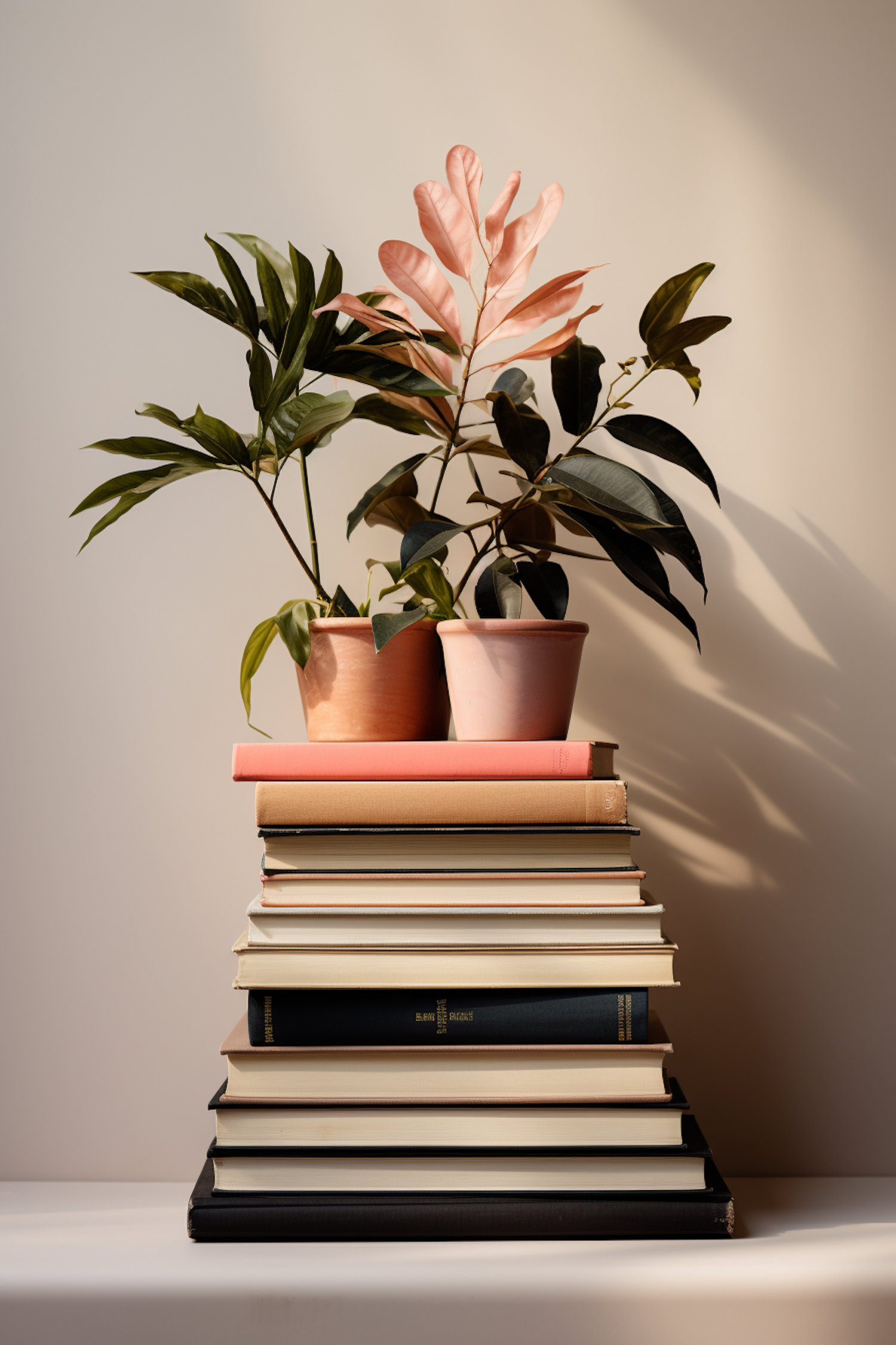 Aesthetic stack of books topped with potted plants, featuring green and pink leaves, in warm natural lighting.