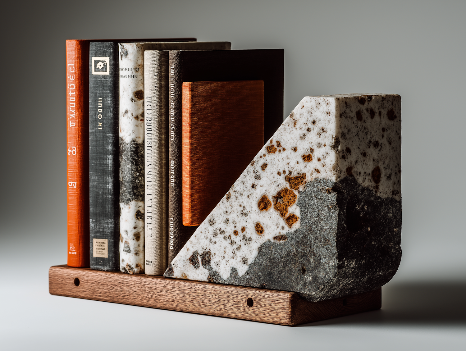 A set of books with diverse covers on a shelf, supported by a uniquely textured concrete and wood bookend, in soft lighting.