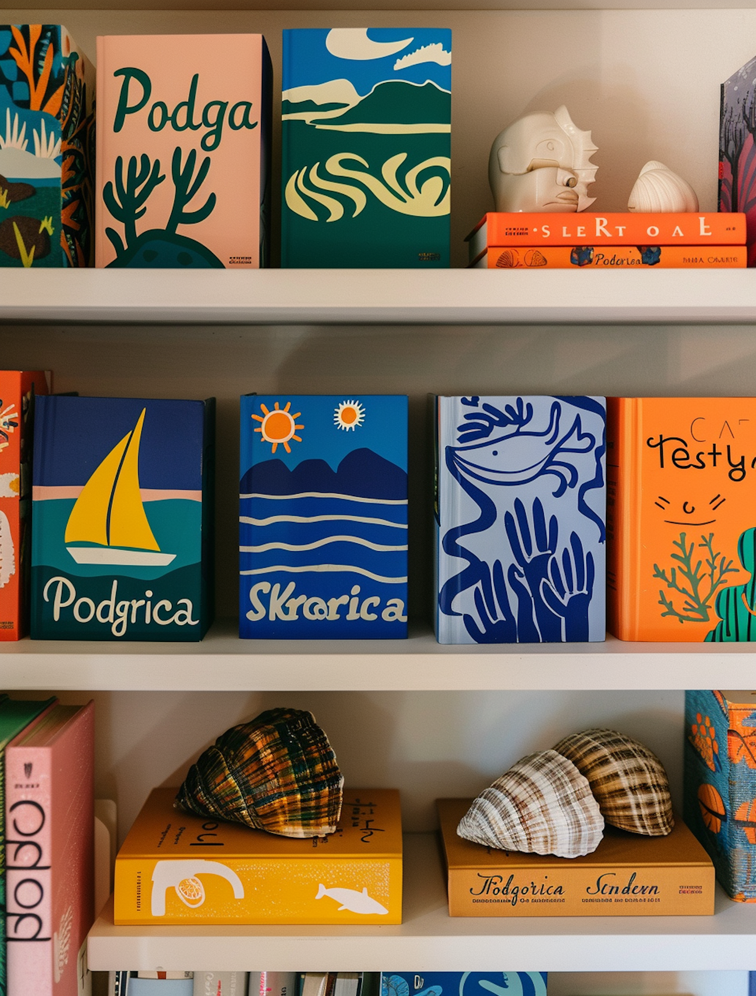 Colorful bookshelf with artistic book covers, seashells, and a fish sculpture, creating a vibrant coastal theme.