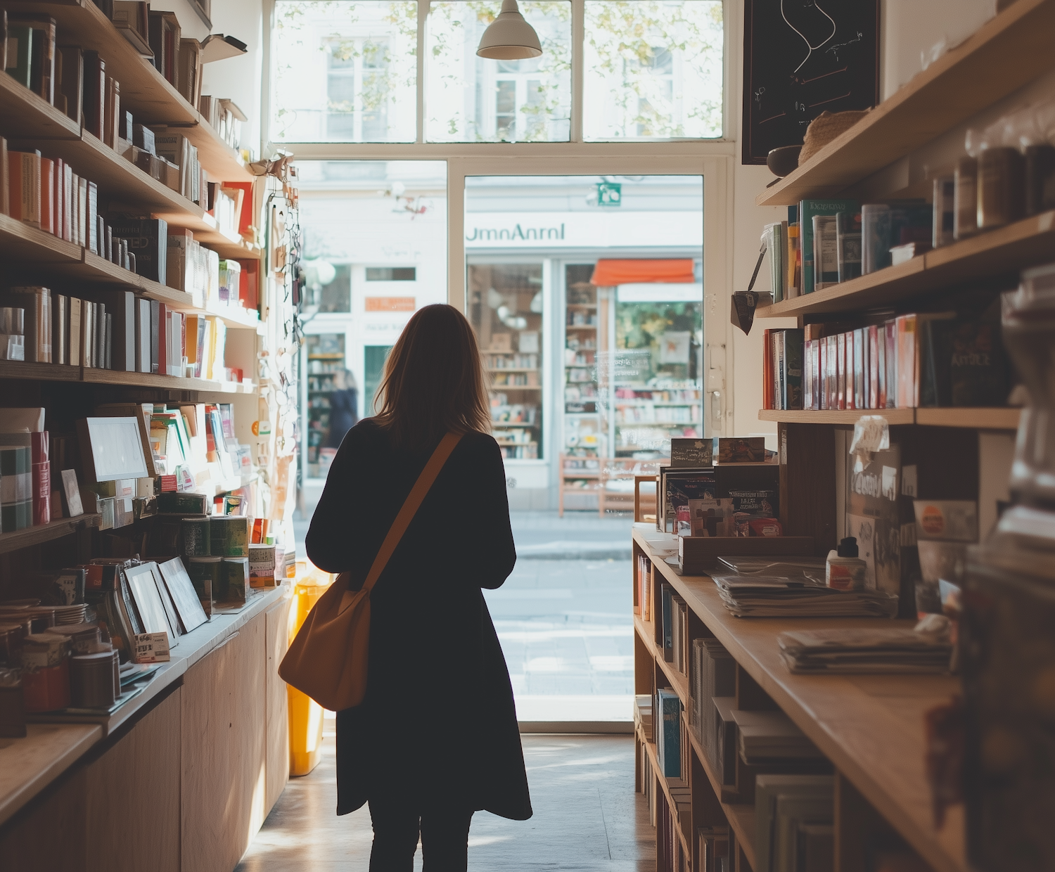 Woman in a cozy bookstore, surrounded by shelves of books, looking towards the bright entrance with a yellow bag.
