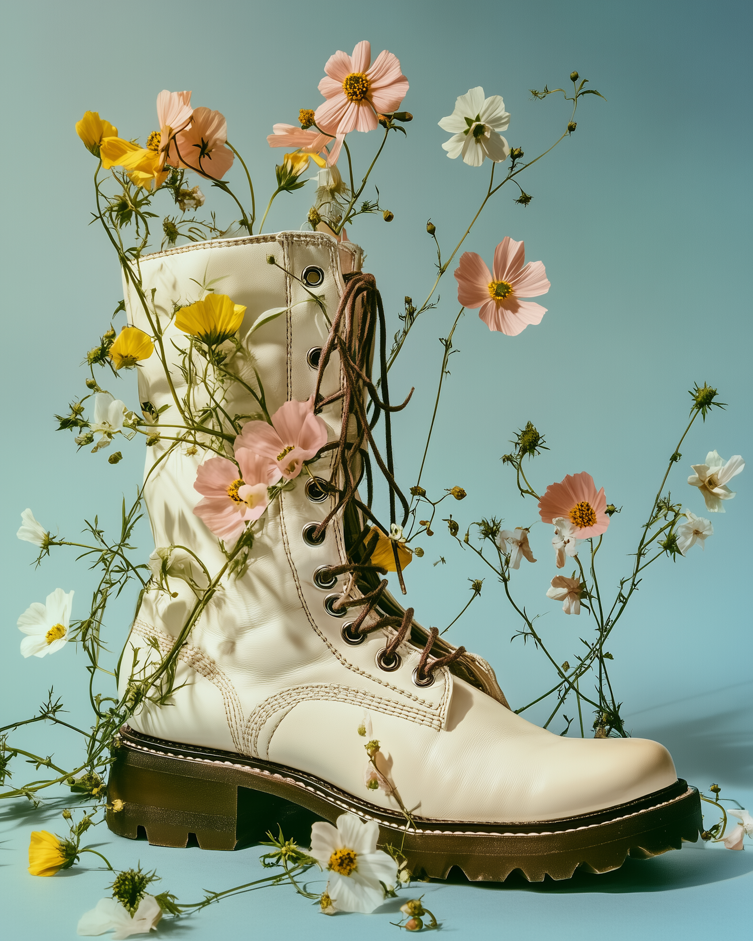 Cream combat boot with wildflowers in pink, yellow, and white against a blue background, blending rugged and delicate aesthetics.