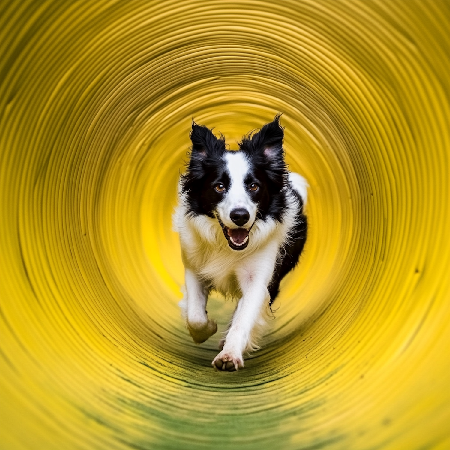 Energetic Border Collie running through a vibrant yellow tunnel, showcasing playful motion and dynamic contrast.
