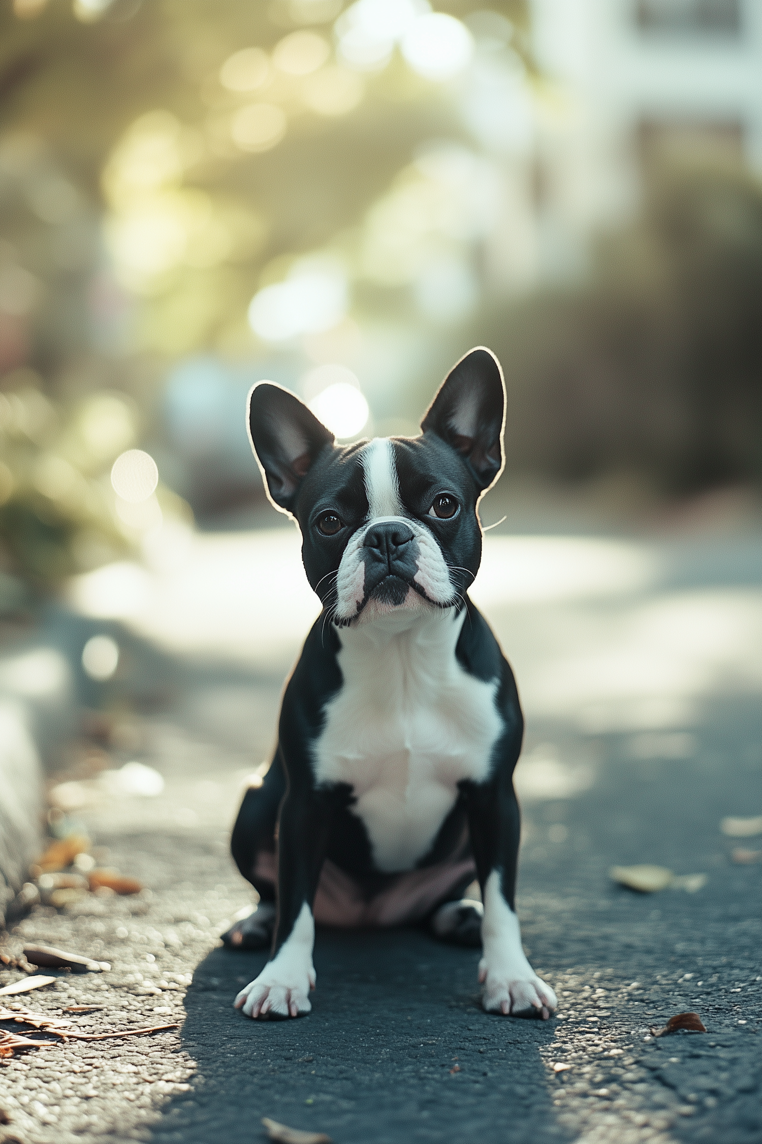 Adorable Boston Terrier sitting on a sunlit path, surrounded by soft, blurred greenery and fallen leaves, creating a serene atmosphere.