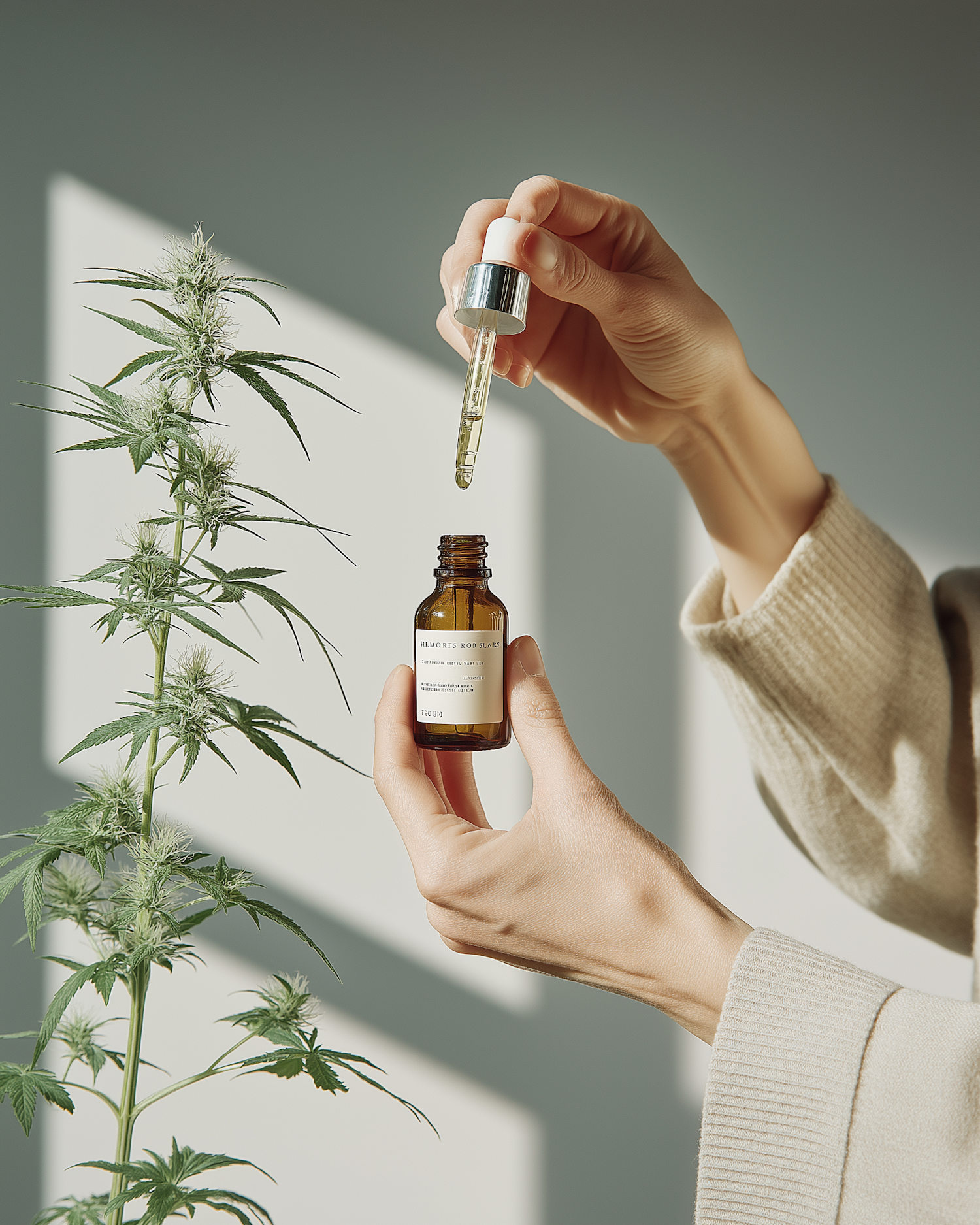 Hands holding a dropper bottle with a cannabis plant in the background, symbolizing natural wellness and botanical care.