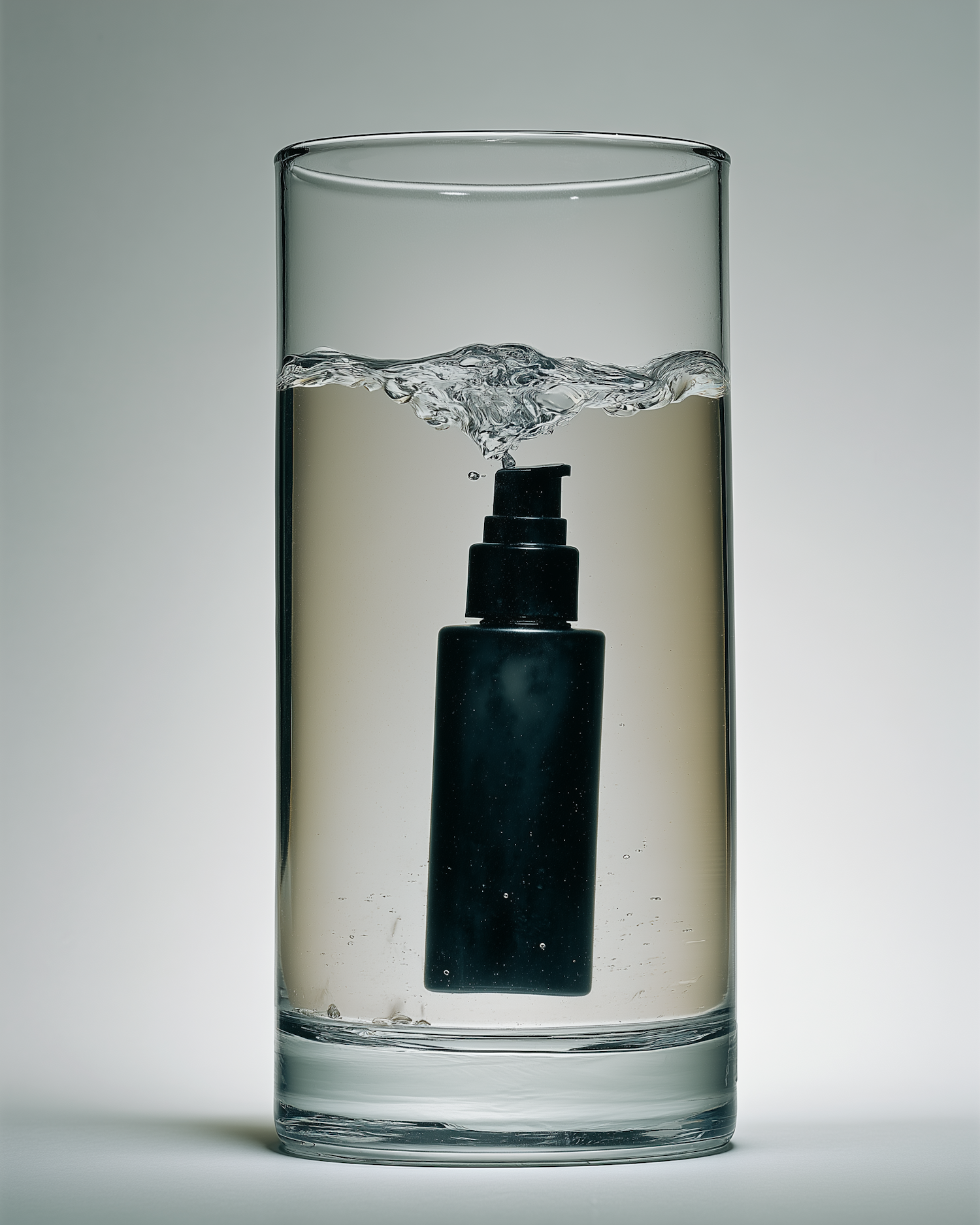 A black pump bottle submerged in a clear glass of water, creating ripples and bubbles against a neutral background.
