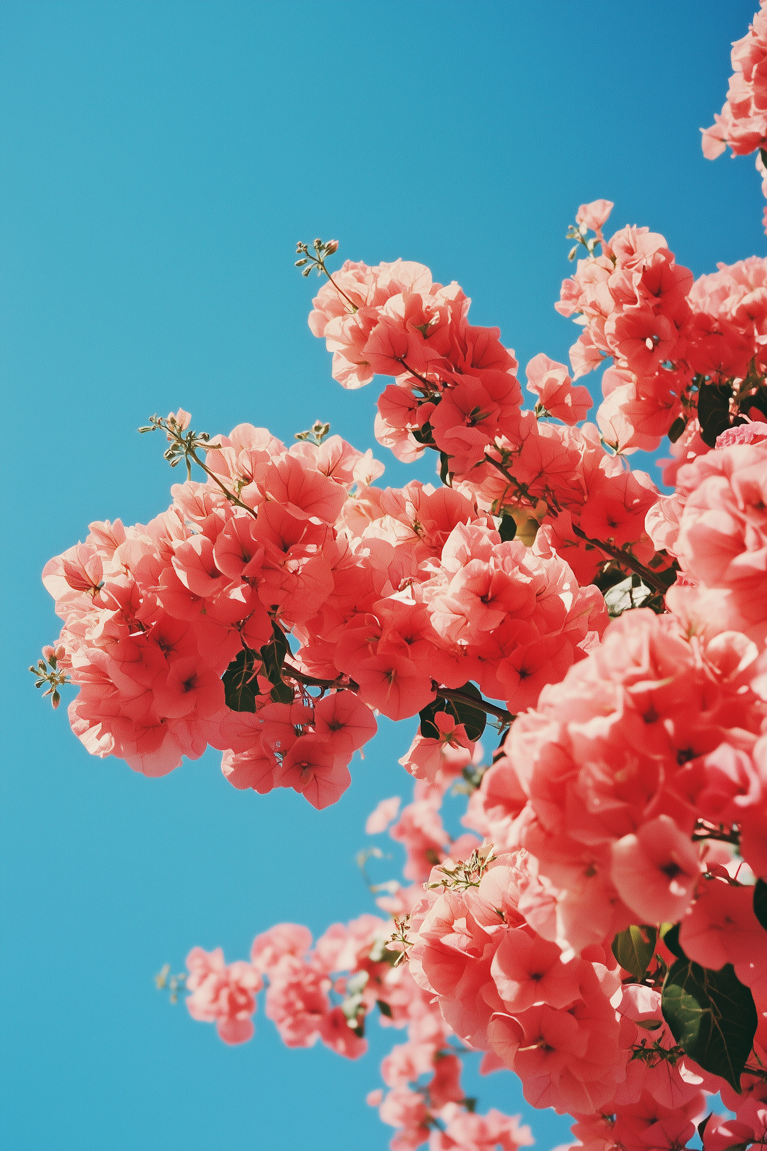 Vibrant pink bougainvillea flowers against a bright blue sky, creating a cheerful and summery vibe with lush greenery peeking through.