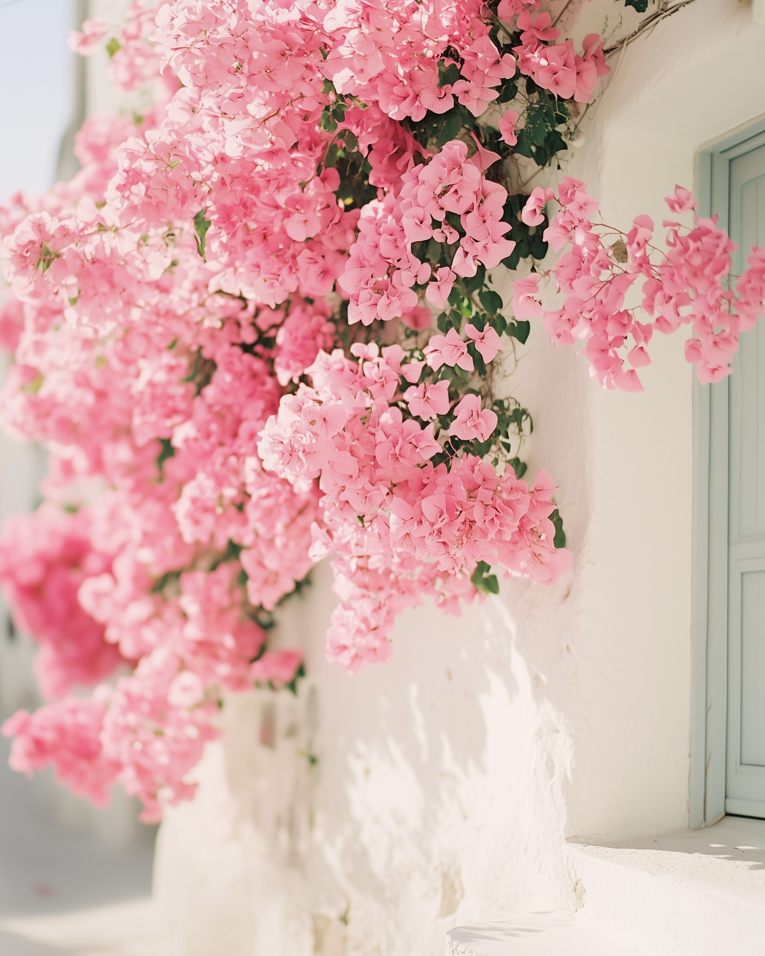 Lush pink bougainvillea cascading over a white wall with a hint of a blue window, creating a serene Mediterranean vibe.
