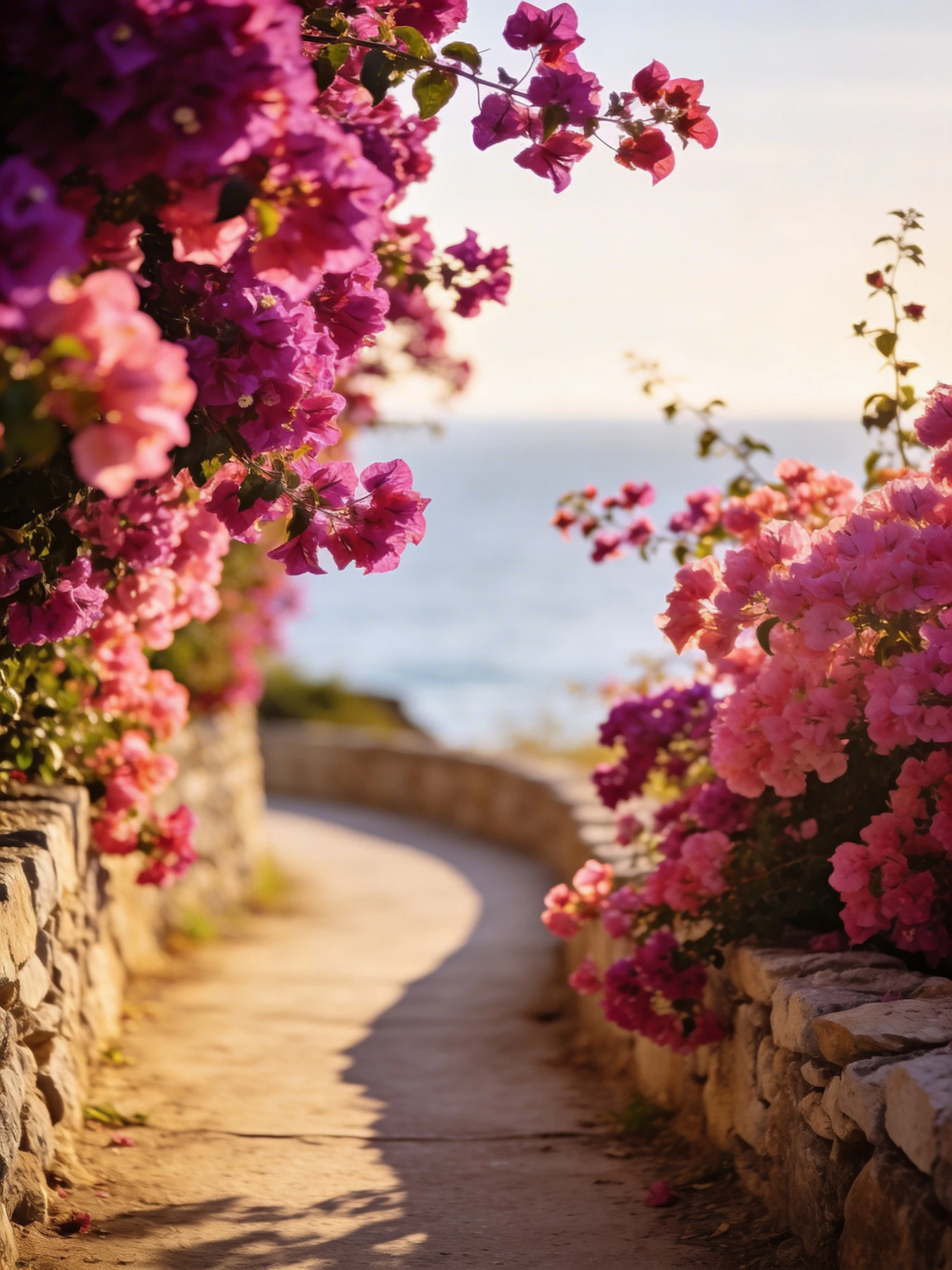 A narrow coastal path lined with flowering bougainvillea on both sides, soft golden light and clean shadows, minimal composition, no text.