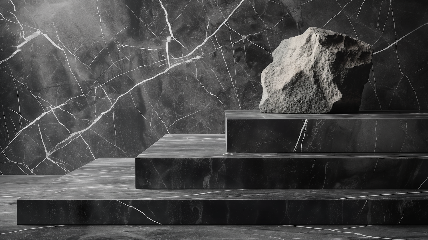 A rugged stone on sleek black marble steps with intricate white veining, creating a striking contrast of textures and elegance.