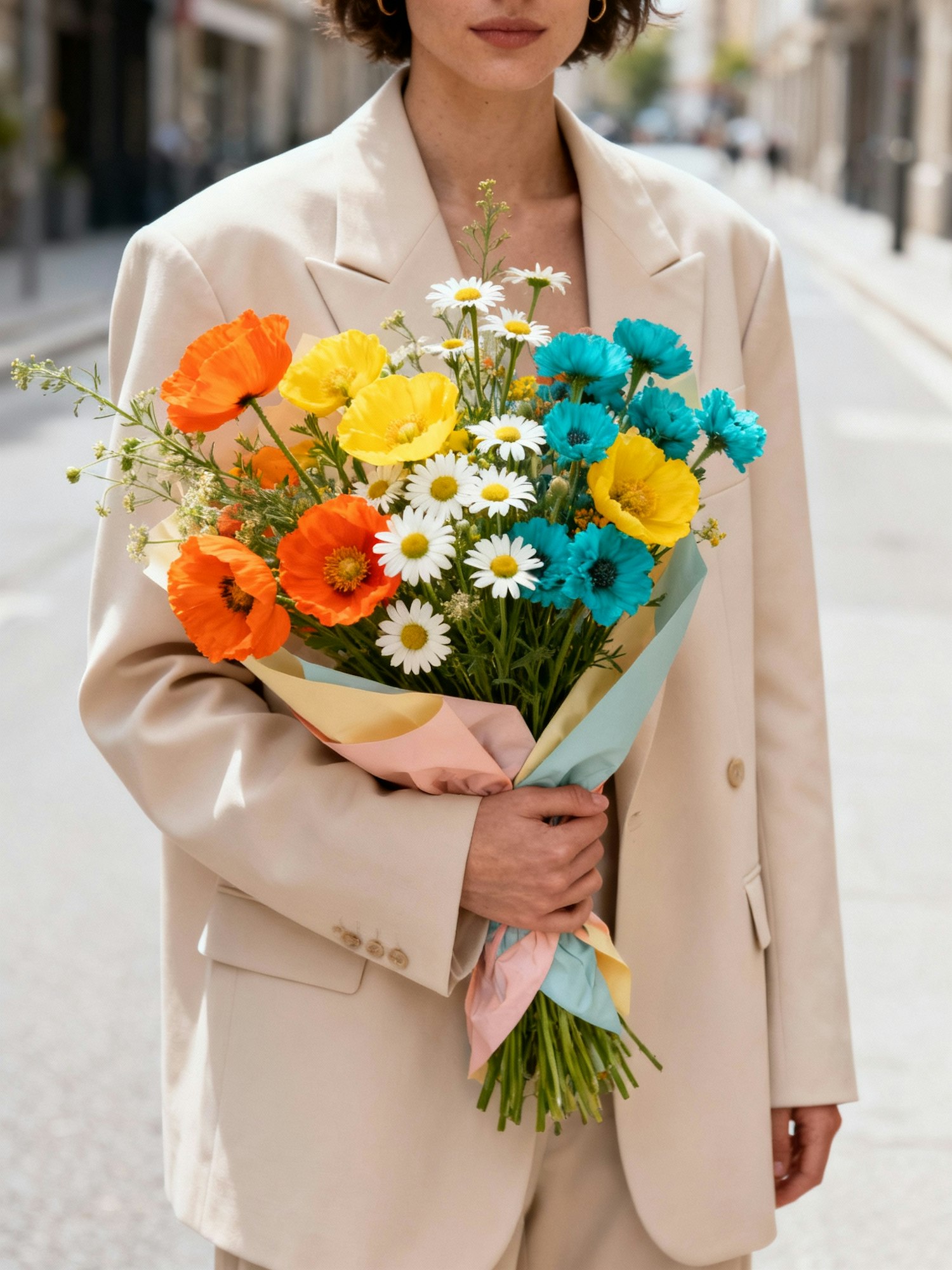 Vibrant bold aesthetic photograph, natural lifestyle style, soft daylight, candid framing, rich textures, colorful flower bouquet, not staged, influencer style photography, high quality realistic details — A person wearing a tailored oversized blazer in soft beige holding a bouquet wrapped in pastel paper, bouquet filled with wildflowers, daisies and poppies in tones of orange, lemon yellow and ocean sapphire, clean urban street background, lifestyle streetstyle look