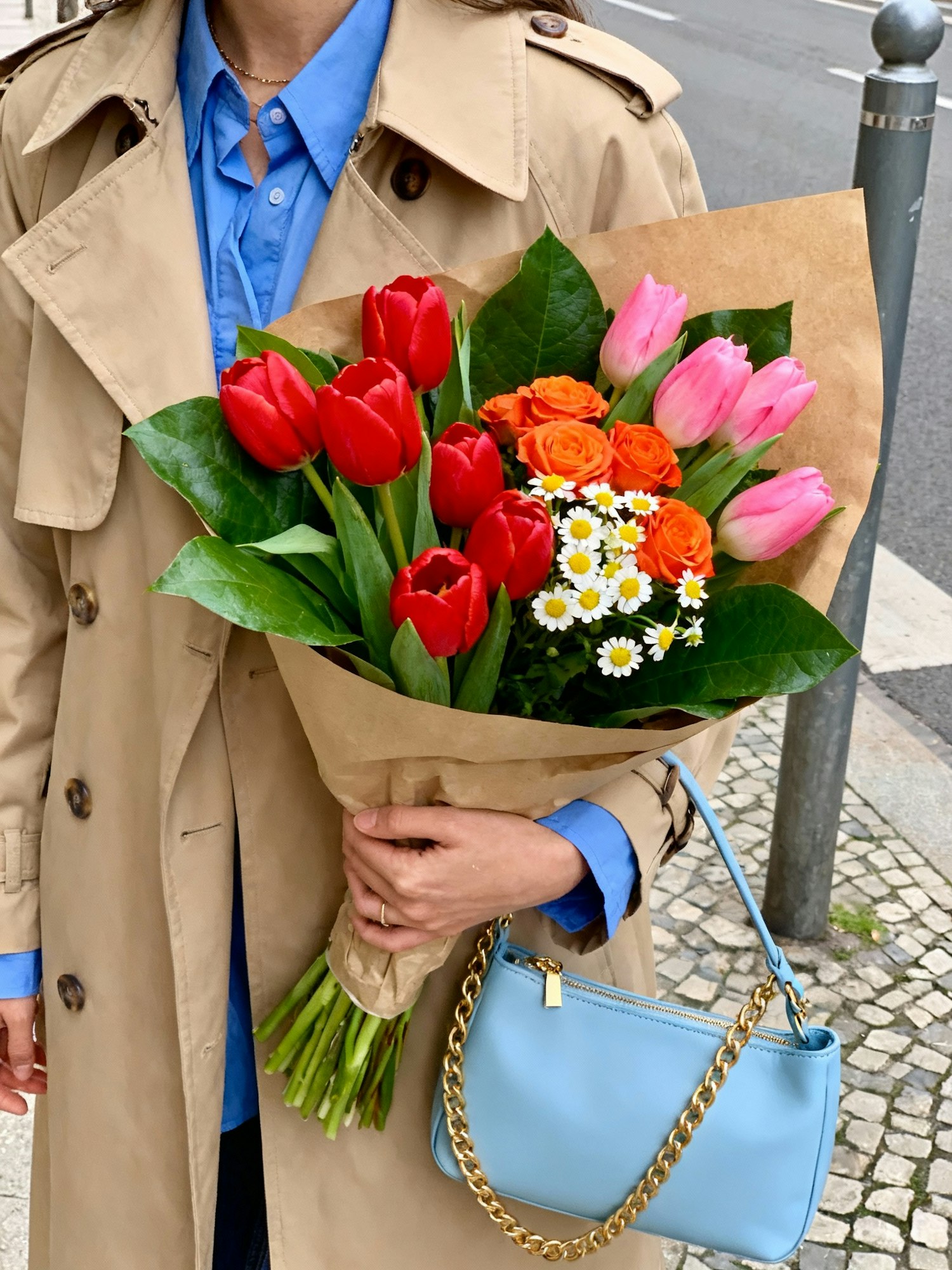 A stylish person holds a colorful bouquet of tulips, roses, and daisies, paired with a beige trench coat and a chic blue handbag.