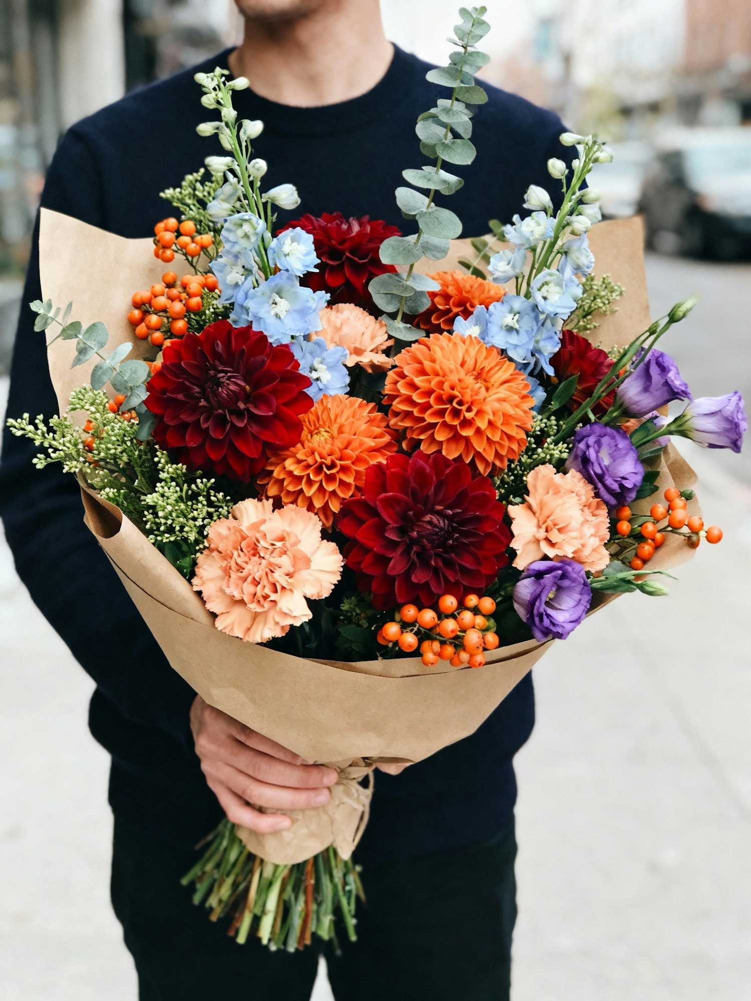 A colorful bouquet of flowers with red, orange, and purple blooms held by a person in a dark sweater on a city street.