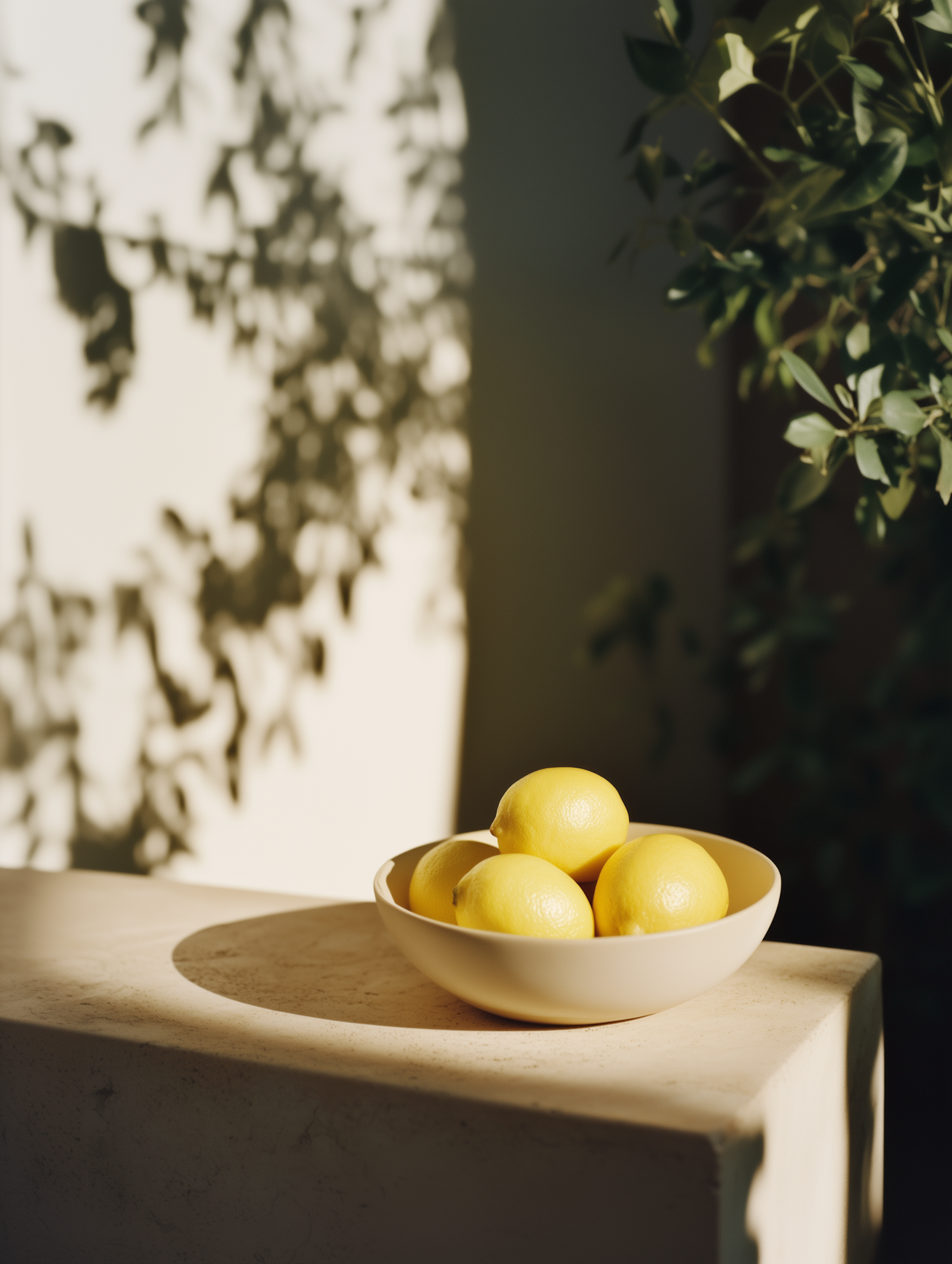 A bowl of vibrant lemons on a sunlit stone surface, with leafy shadows creating a serene, natural ambiance.