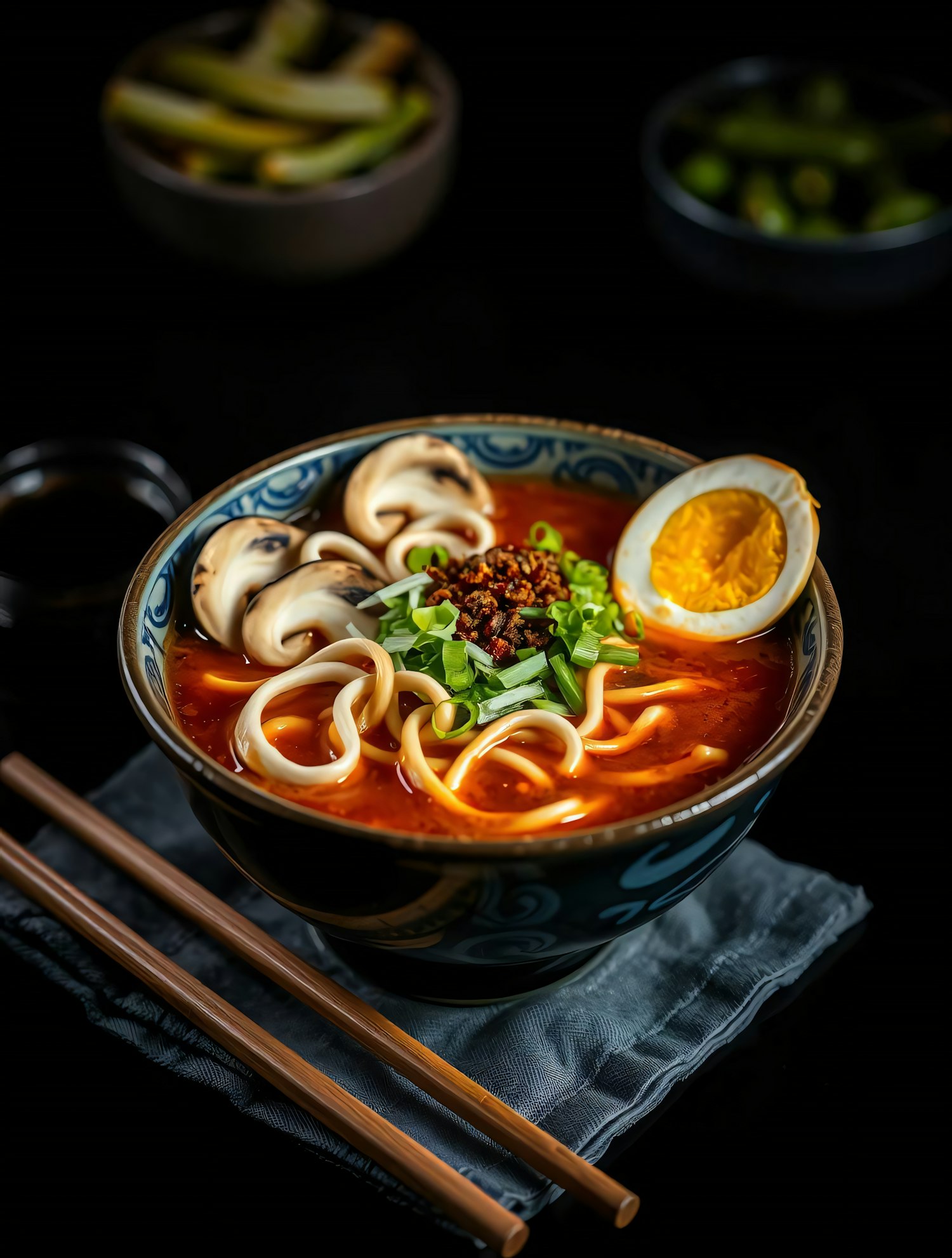 Delicious ramen bowl with rich broth, noodles, egg, mushrooms, and chili flakes, served with chopsticks on a dark background.