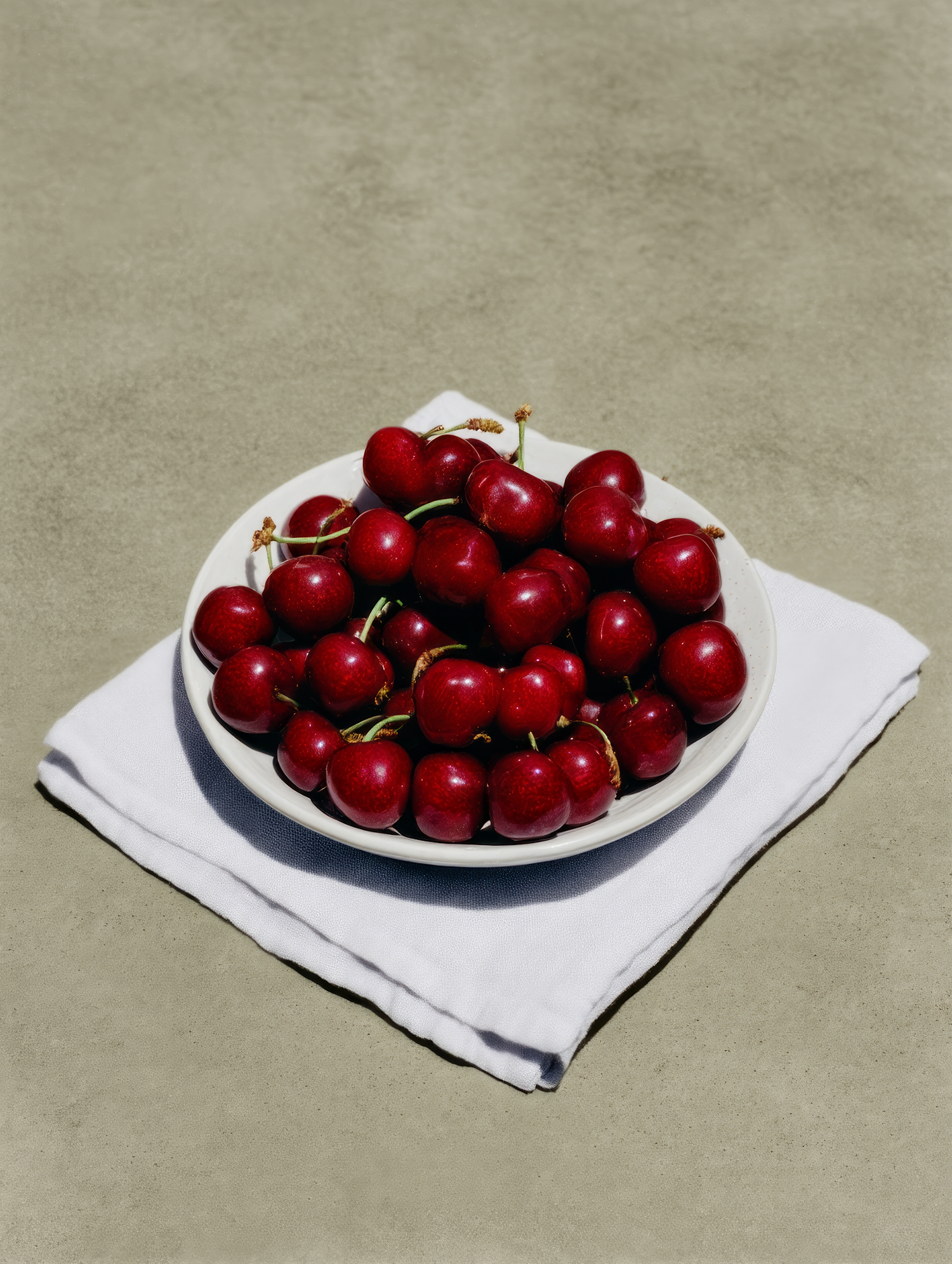 A bowl of fresh red cherries on a white cloth, set against a neutral background, showcasing their vibrant color and glossy texture.