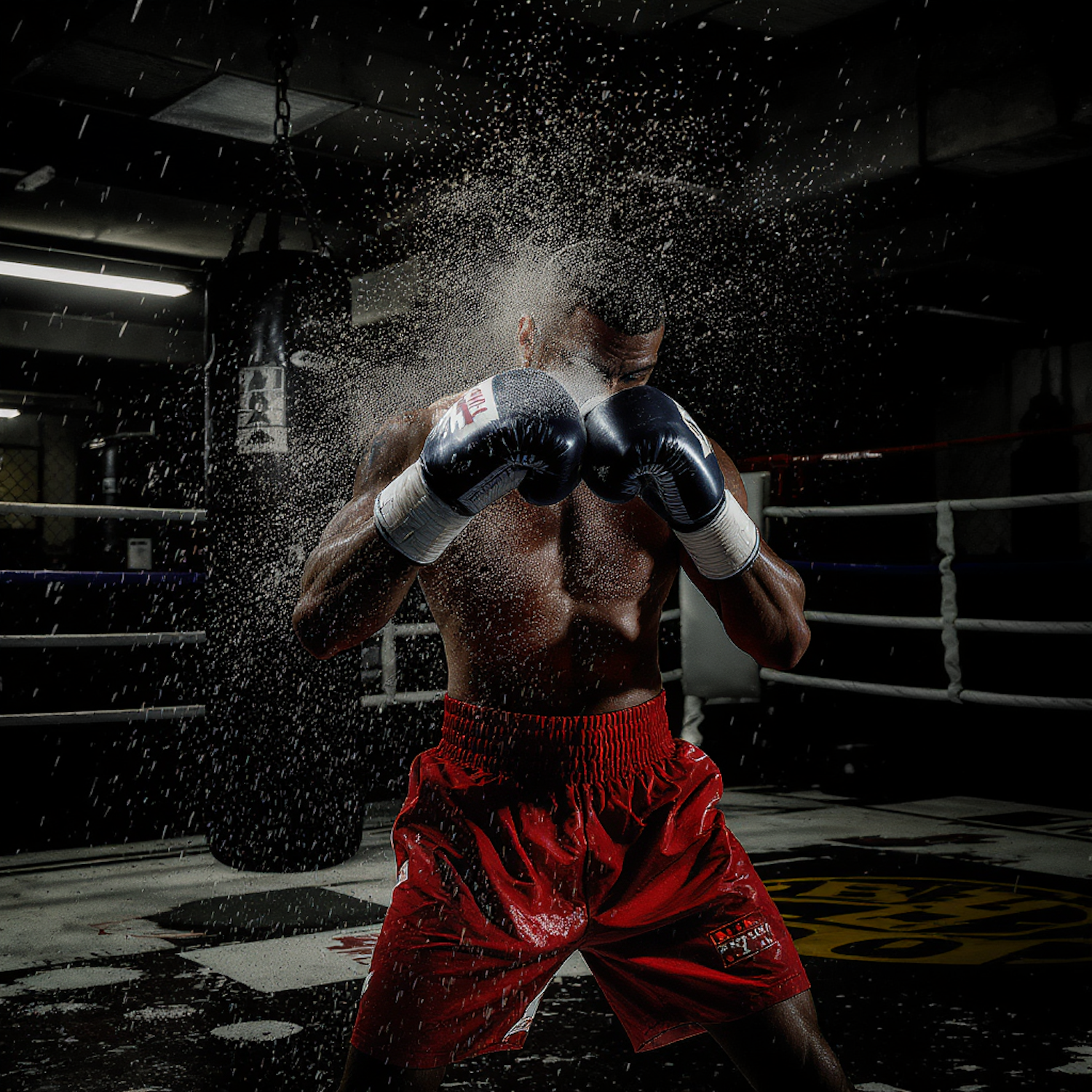 A boxer in red shorts and blue gloves captured mid-action in a gym, with water spray adding dramatic intensity to the scene.