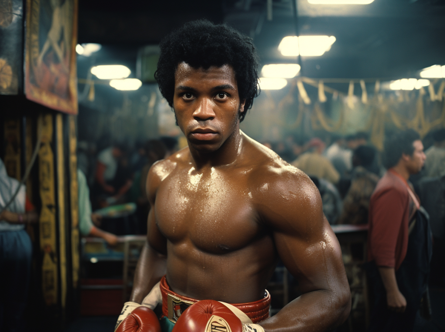 A determined boxer with red gloves stands in a dimly lit gym, showcasing his muscular physique and intense focus.