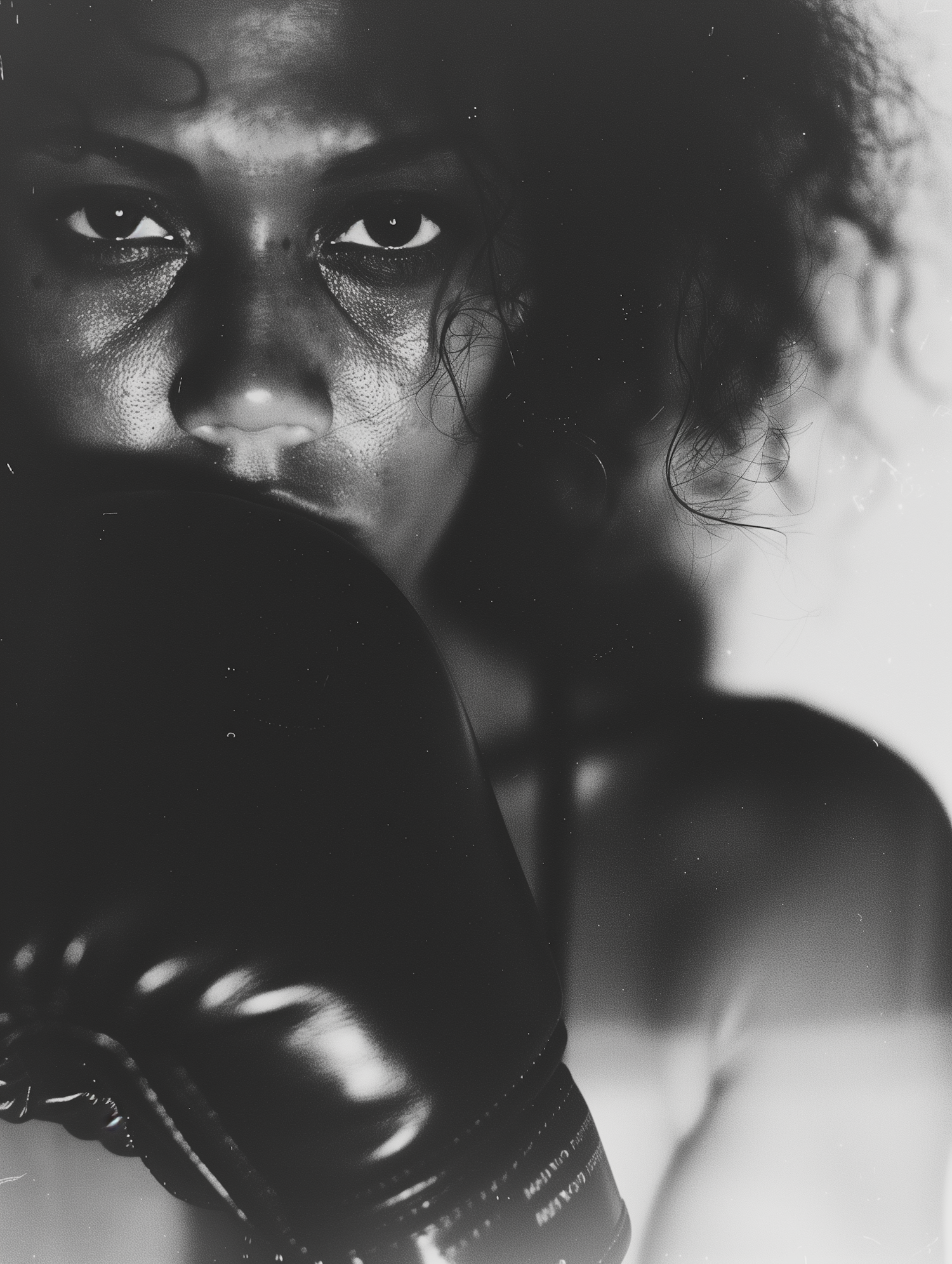 Black-and-white close-up of a woman with a boxing glove, her intense gaze and dramatic lighting create a powerful and striking portrait.