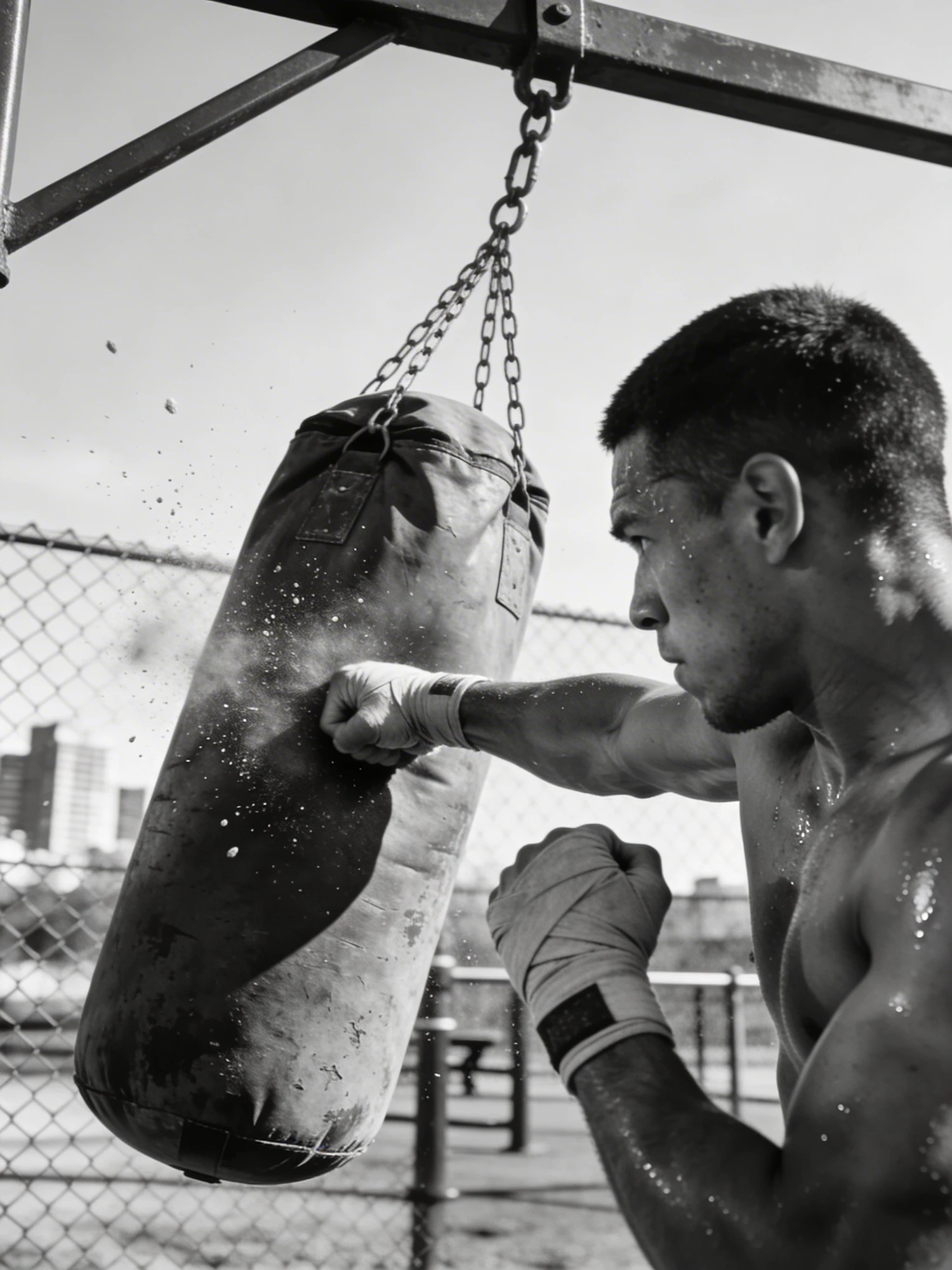 A black-and-white photo of a man boxing a punching bag outdoors, showcasing intense focus and dynamic motion in an urban setting.