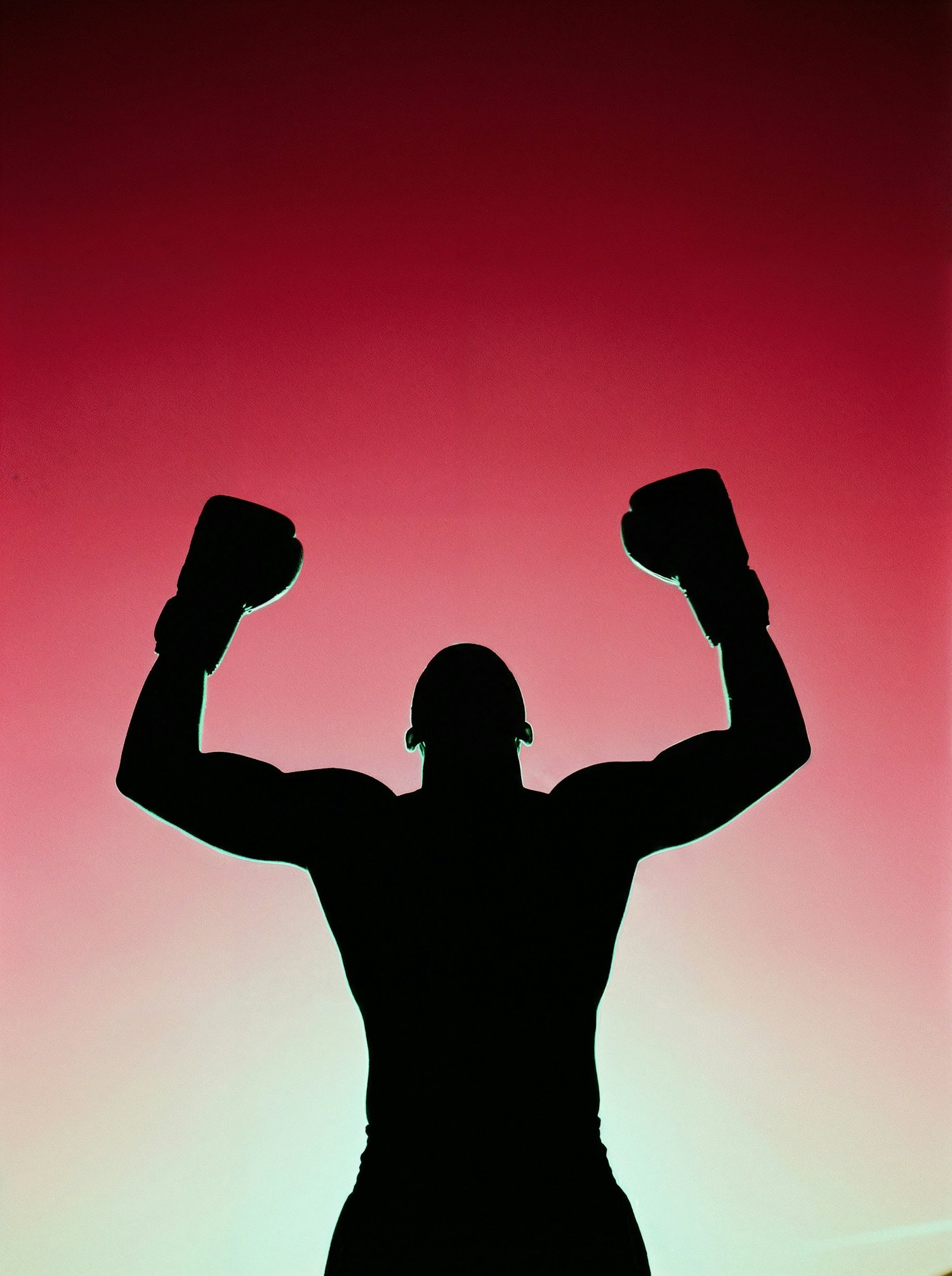 Silhouette of a boxer raising arms in victory against a vibrant red gradient background, symbolizing strength and triumph.