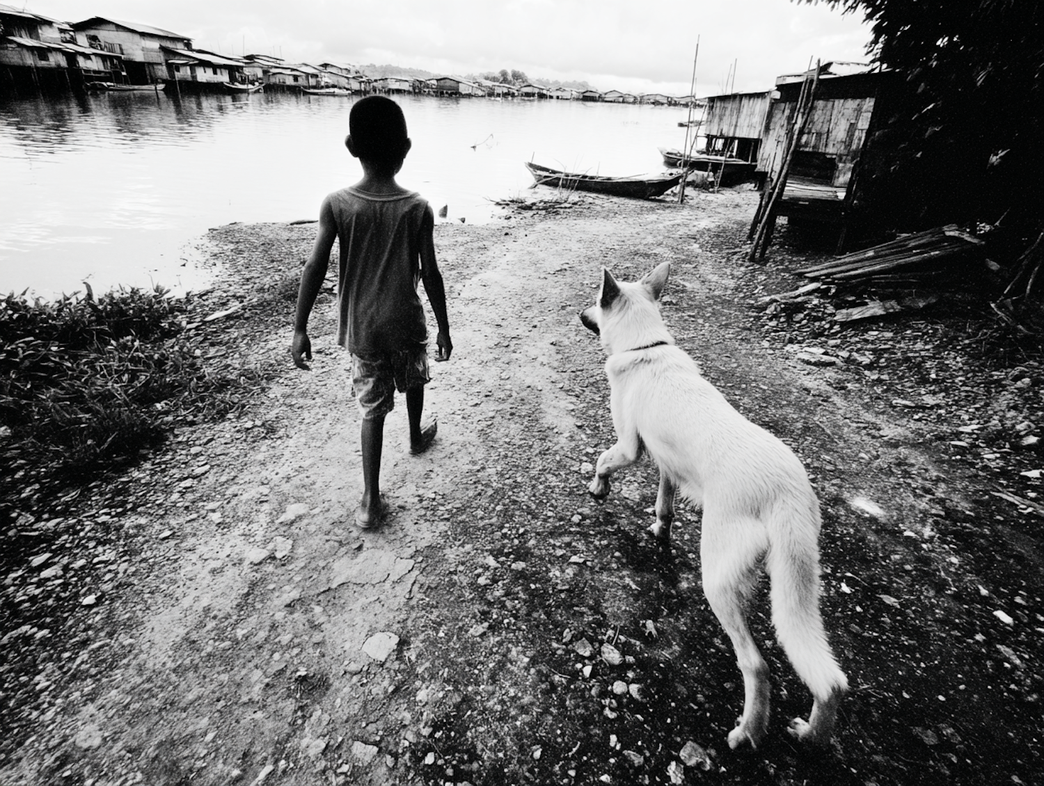 A serene black-and-white image of a boy and a dog walking along a waterside path, bordered by rustic stilt houses and calm waters.