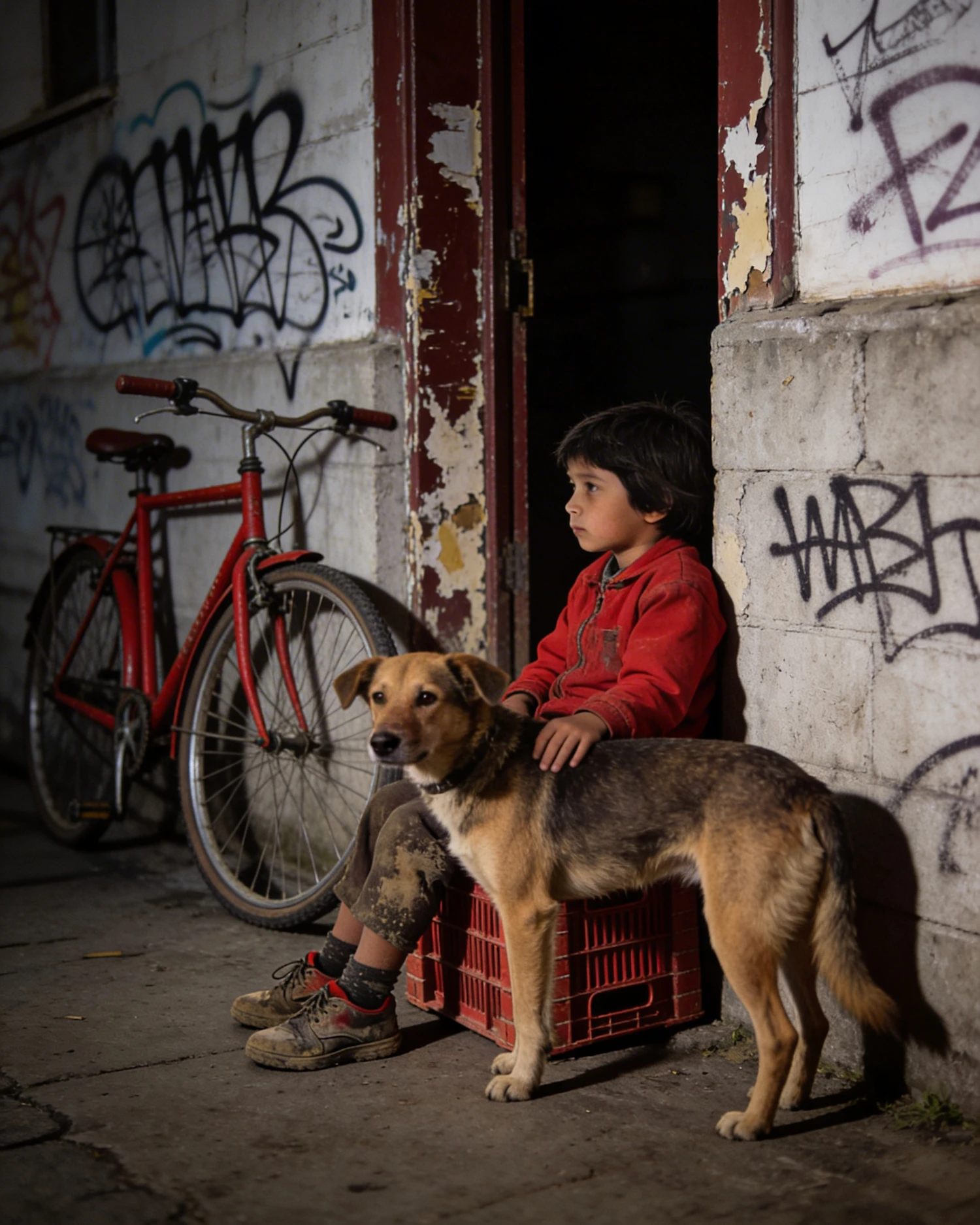 A boy sits on a crate with his dog in an urban alley, surrounded by graffiti and a red bicycle, creating a gritty yet heartfelt scene.