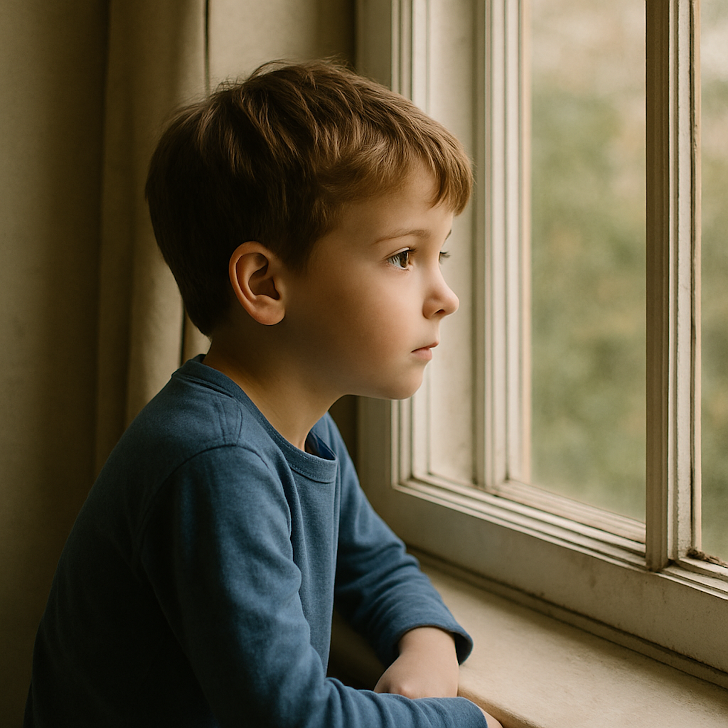 A young boy in a blue shirt gazes thoughtfully out a window, with soft natural light highlighting his contemplative expression.