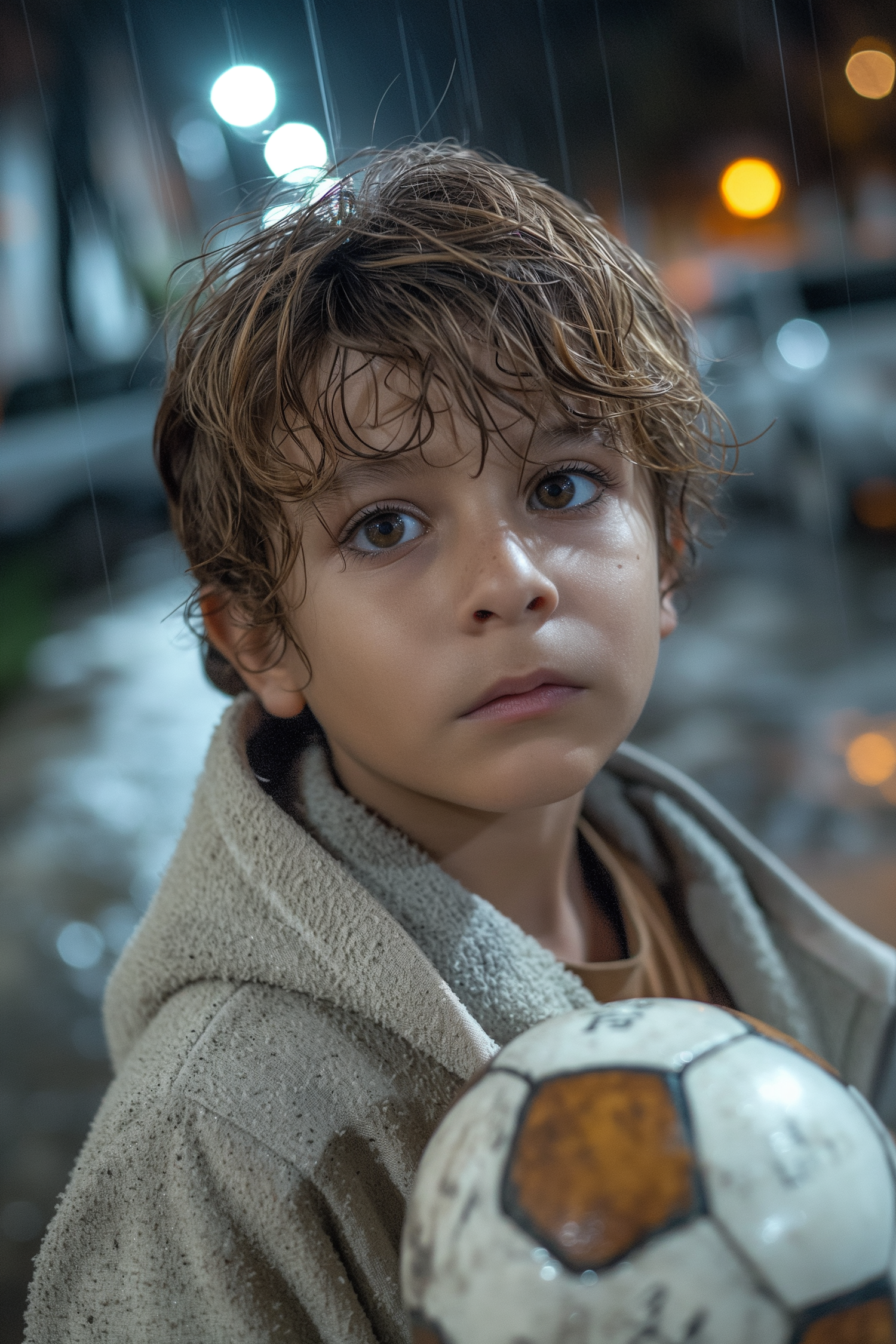 Young boy with wet hair holds a soccer ball in the rain, gazing thoughtfully. Nighttime urban setting with blurred lights in the background.