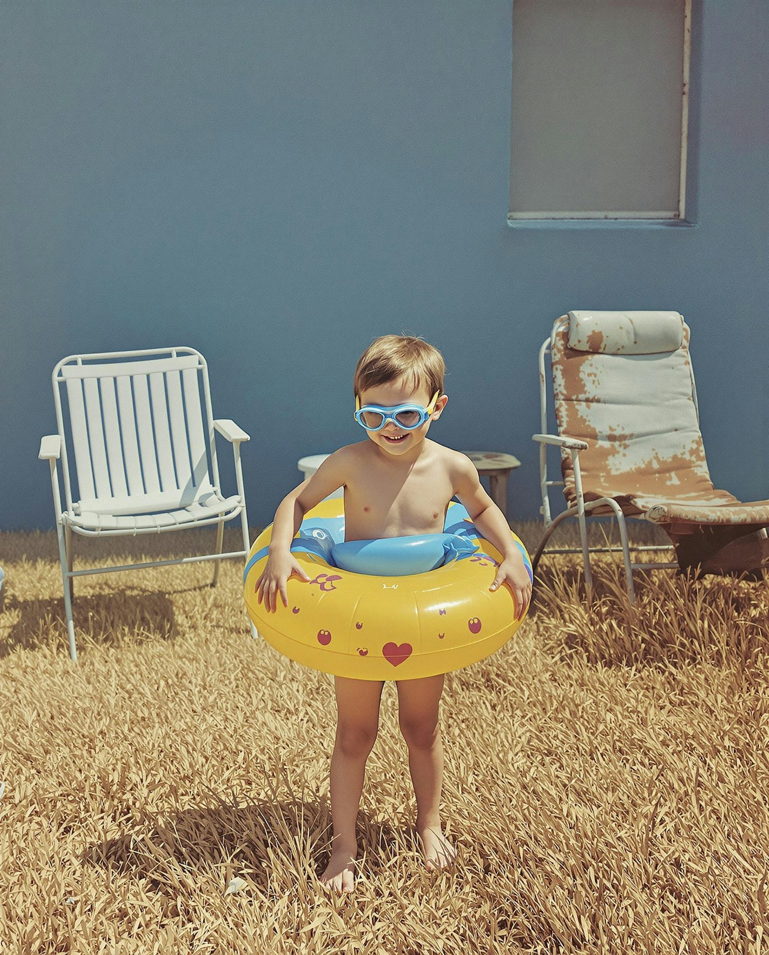 A cheerful boy in goggles and a yellow pool float stands in a dry yard with retro chairs and a blue wall in the background.