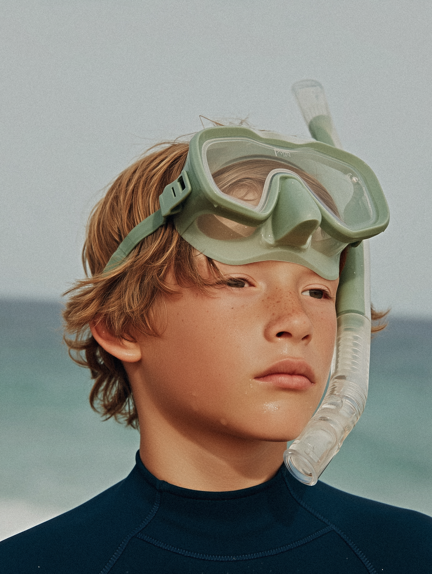 A young boy in a green snorkel mask and wetsuit gazes thoughtfully at the beach, with the ocean in the background.