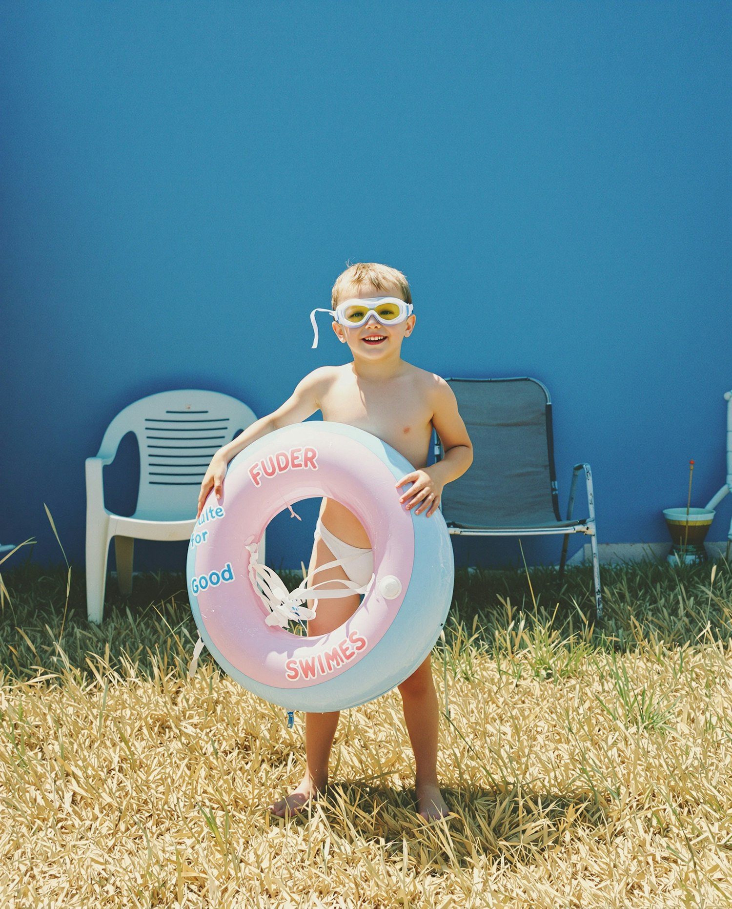 Natural daylight photo with warm tones and subtle contrast, slightly overexposed highlights, soft shadows, and a light analog grain. Vibrant but realistic colors with a summery, editorial feel. The photo should look candid, fun, and lightly ironic, with a touch of spontaneity and humor. A child with goggles and a swim ring, standing on dry grass far from any pool, looking proudly into the lens as if ready to dive. Background: a blue wall and a dusty garden chair.
