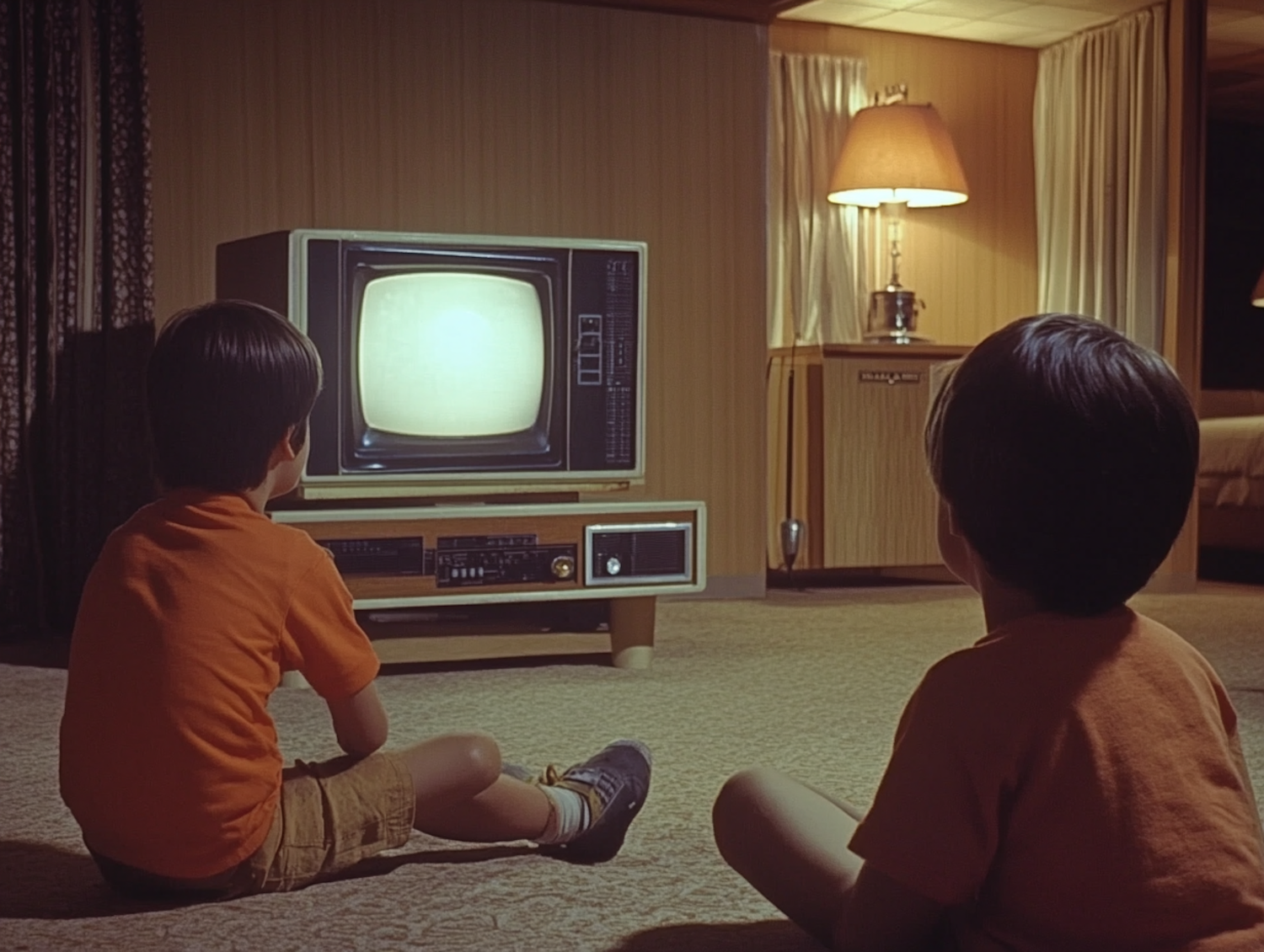 Two boys in orange shirts sit on a carpet, watching a vintage TV in a dimly lit room with retro decor.
