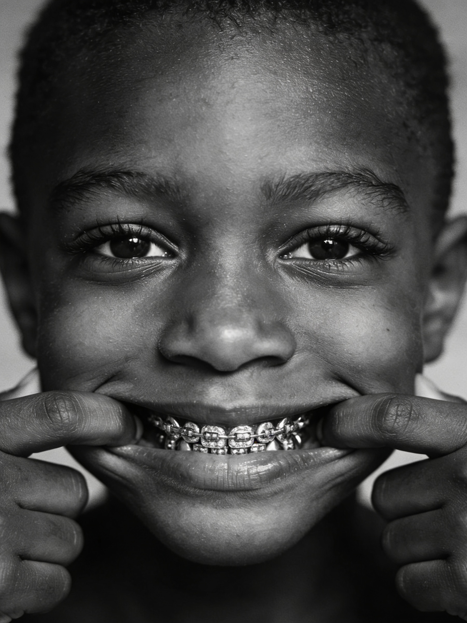 Black-and-white close-up of a young person smiling, showcasing braces with a playful expression and detailed facial features.