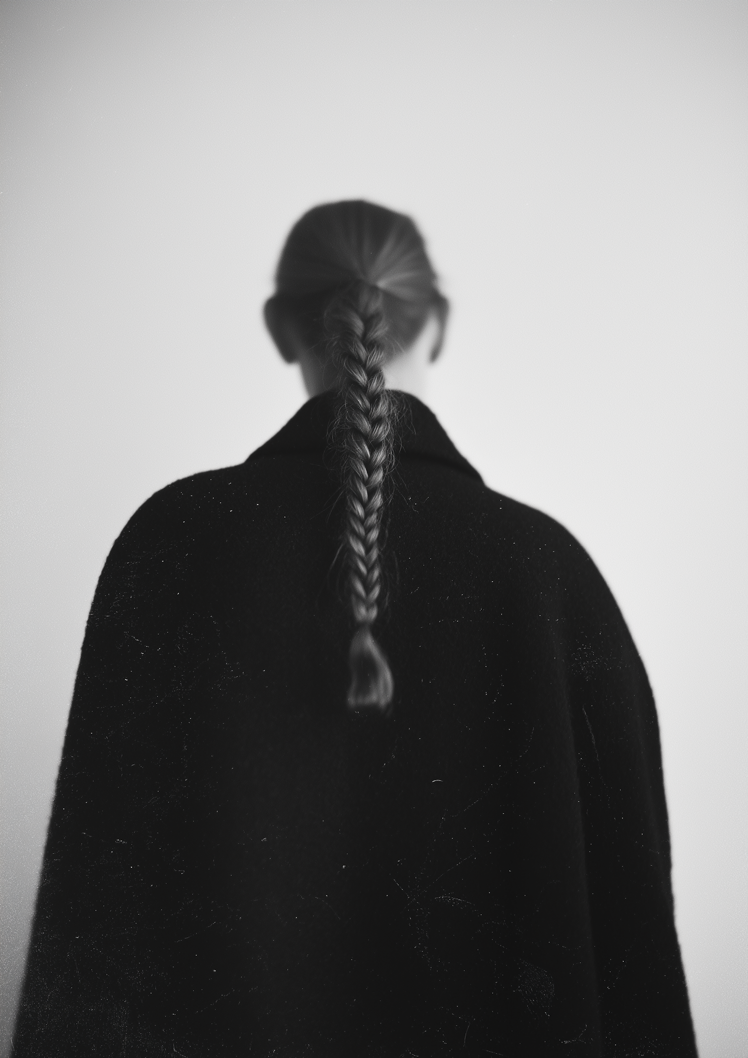 Elegant minimalistic monochrome image of a person with a braided hairstyle, emphasis on contrast and simplicity.