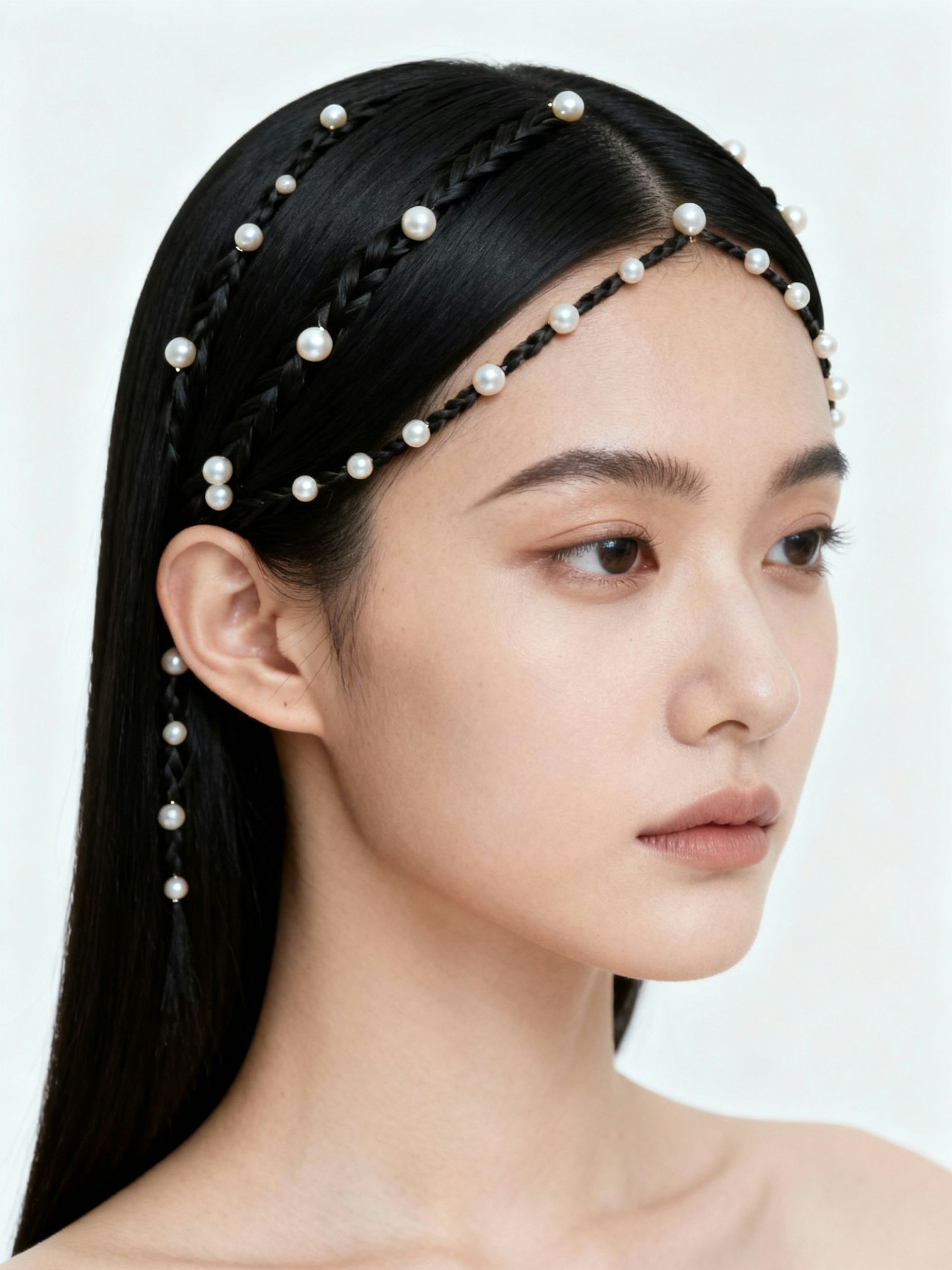 Studio portrait, plain white seamless background, soft even lighting, clean editorial aesthetic, no shadows, high detail, realistic photography, sharp focus on face and hair accessories Close-up of a young woman with light skin and long straight black hair parted down the middle. She looks to the side with a calm expression. Dozens of small pearl beads are threaded into her hairline and braids, forming symmetrical rows that shimmer softly against the dark hair.