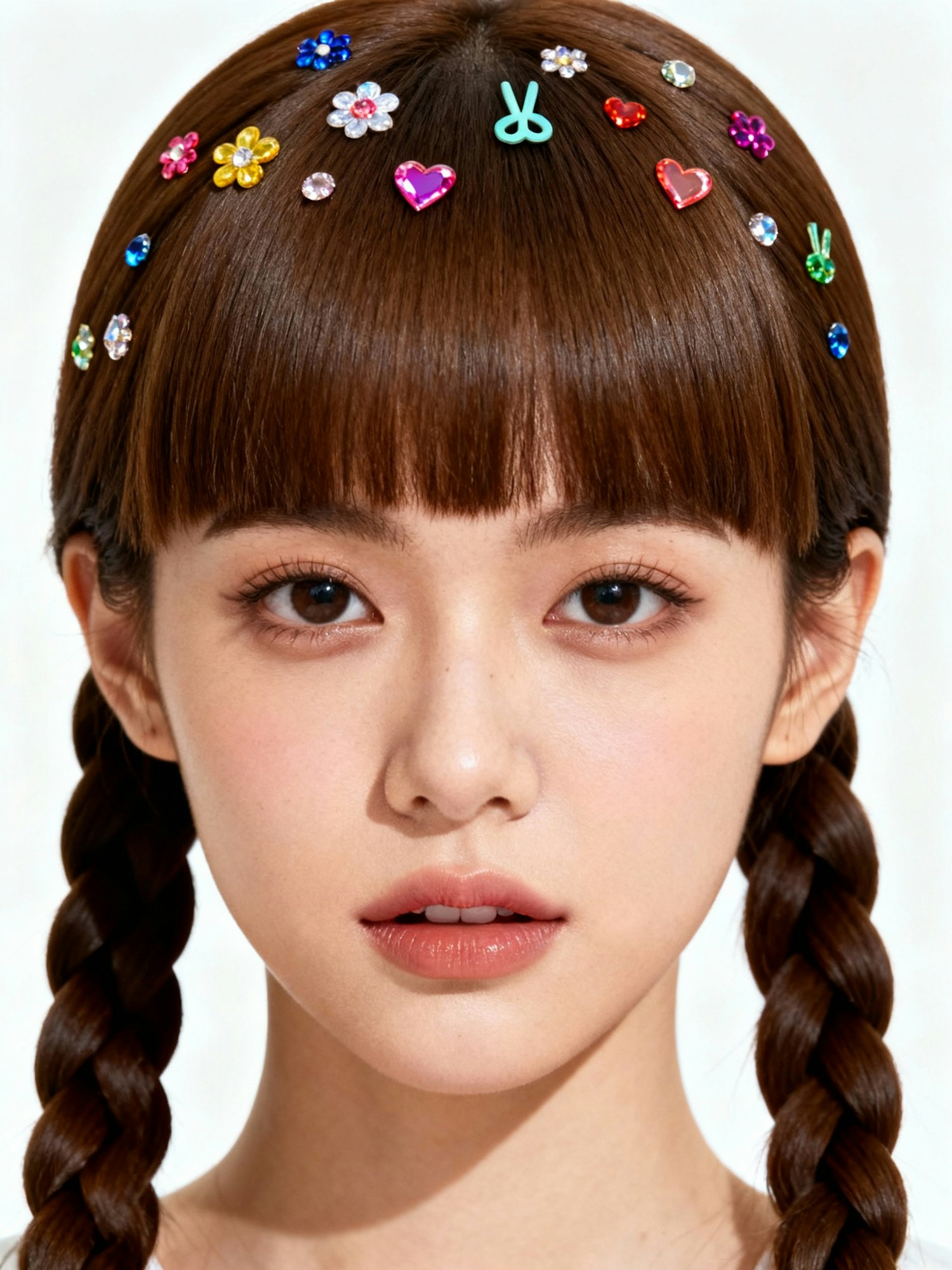 Studio portrait of a young woman with unique hairstyle, plain white seamless background, clean lighting, realistic photography, no shadows, editorial aesthetic, high detail, focus on hair accessories Her straight brown hair styled into two braids, bangs cut blunt and short, hair decorated with small colorful rhinestone stickers forming playful shapes like flowers, hearts, and peace signs scattered across the top of her hair.