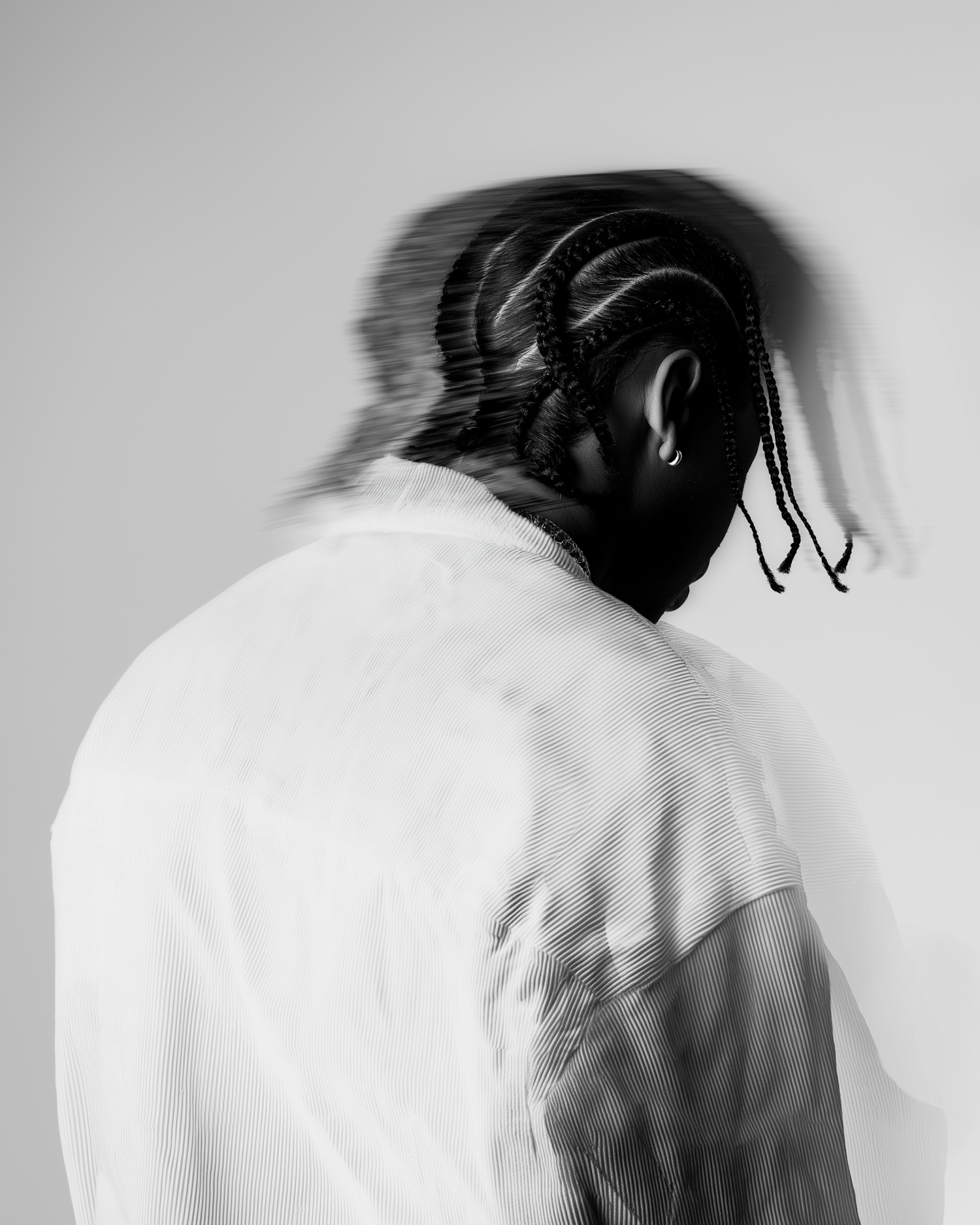 Black and white photo of a person with braided hair and motion blur effect, wearing a striped shirt against a plain background.