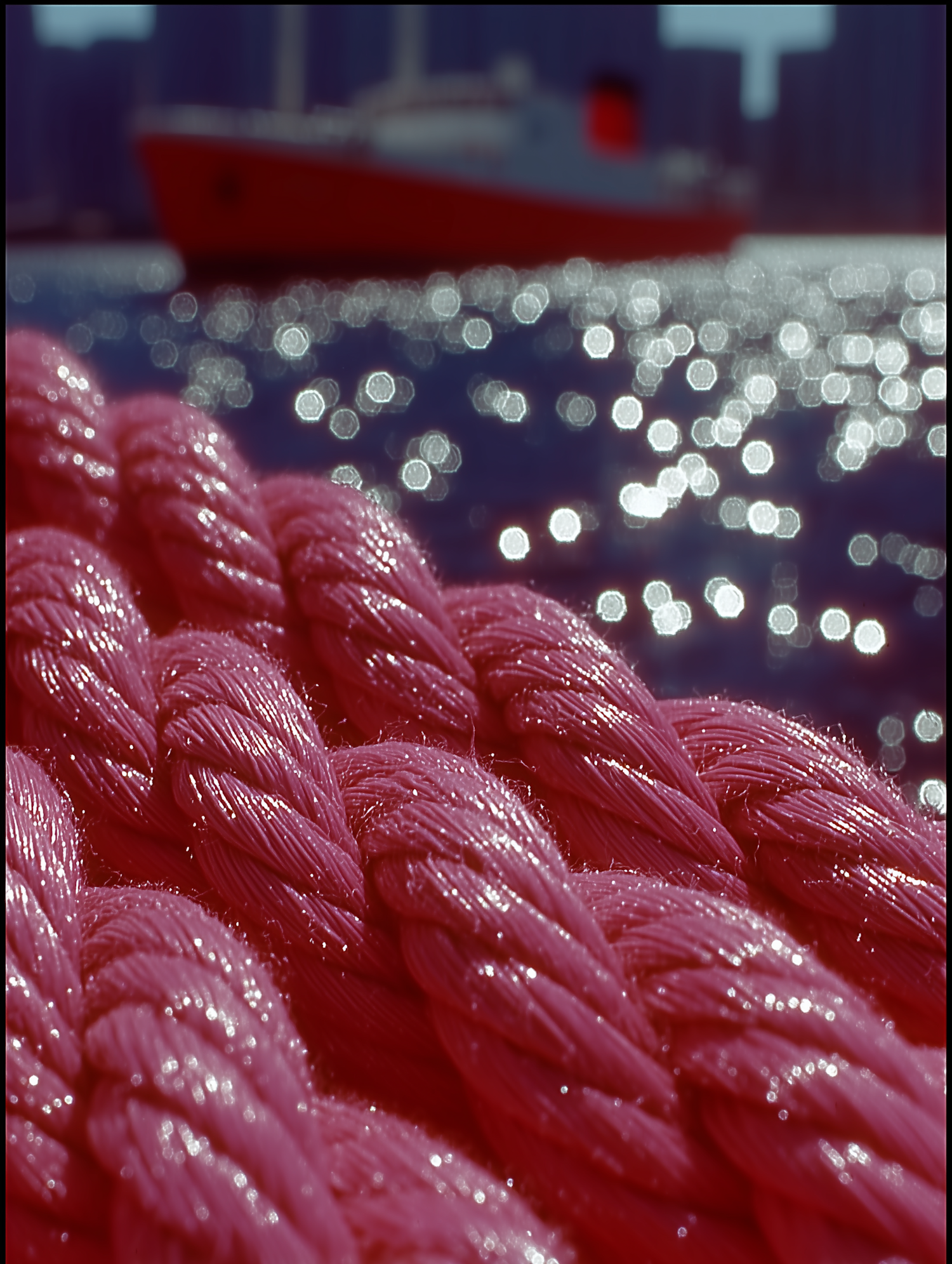 Close-up of glossy pink braided ropes with a blurred red ship and sparkling water in the background, creating a vibrant nautical scene.