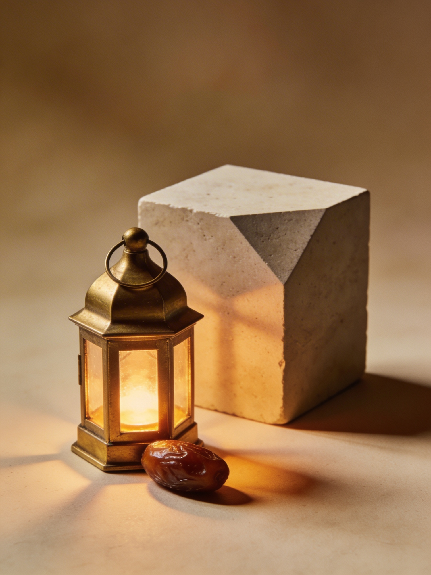 A warm-lit brass lantern, a glossy date fruit, and a geometric stone block create a serene and minimalistic composition.