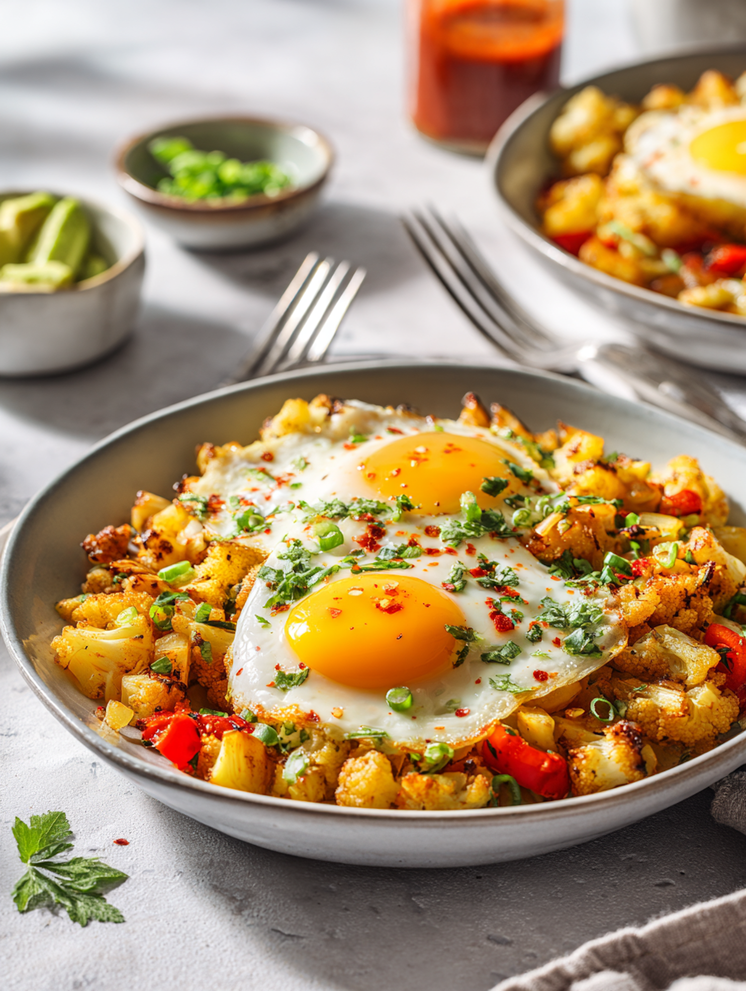 A delicious breakfast hash with roasted potatoes, peppers, and sunny-side-up eggs, garnished with herbs and chili flakes for a flavorful start.