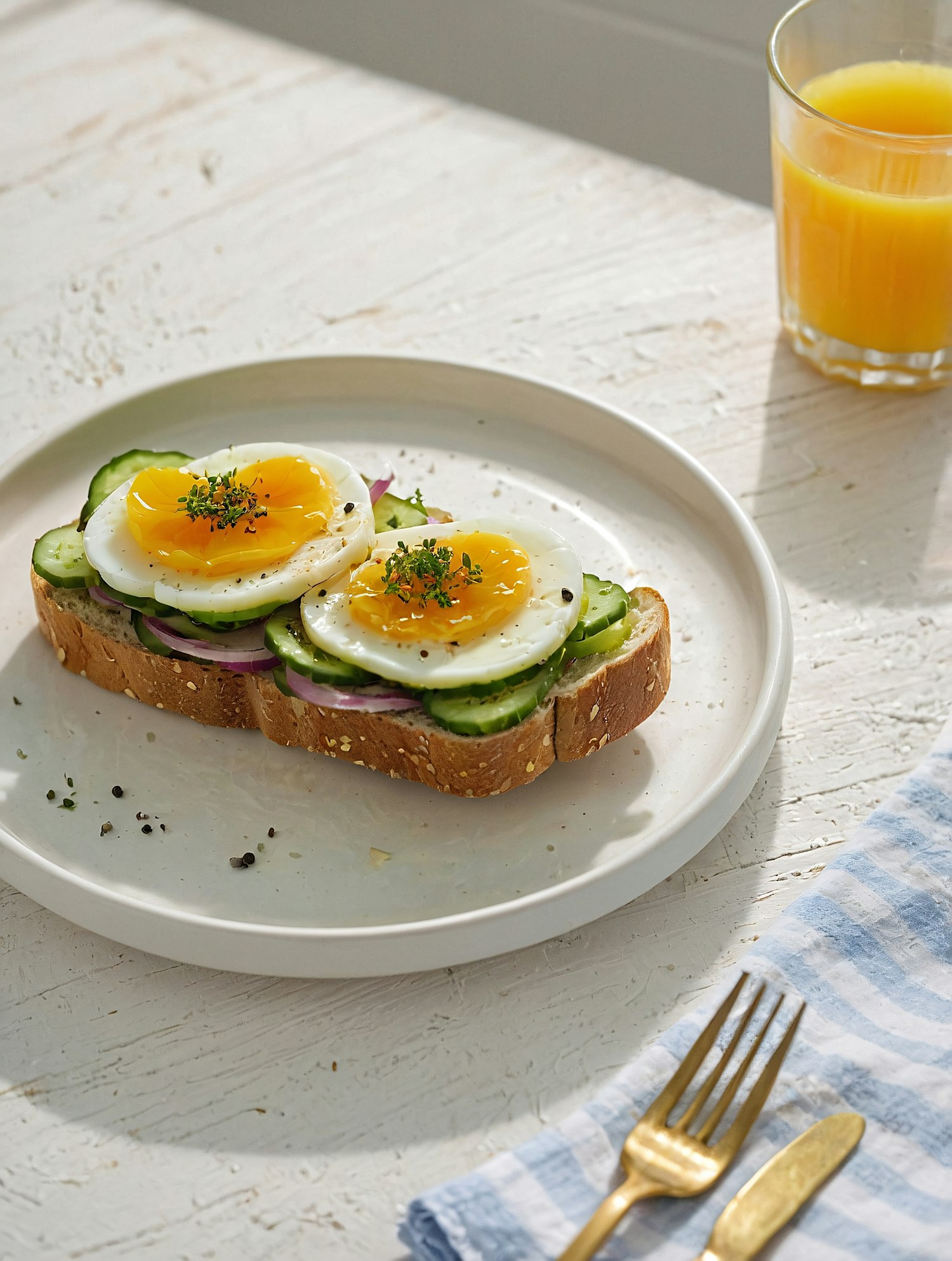 Delicious open-faced sandwich with soft-boiled eggs, cucumber, and herbs, paired with orange juice on a sunny breakfast table.