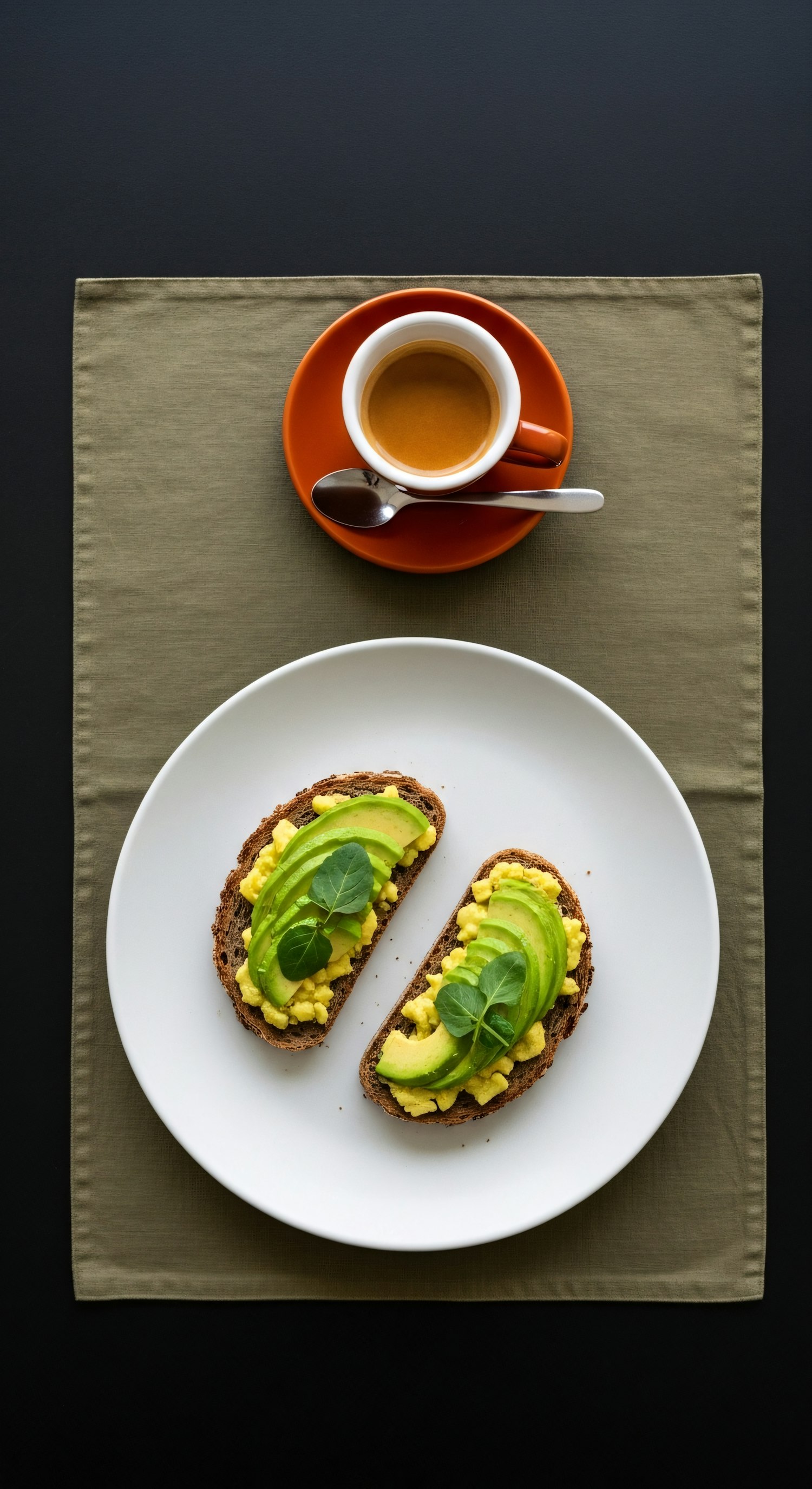 Delicious avocado toast with scrambled eggs and greens, paired with a fresh espresso on a stylish table setting.