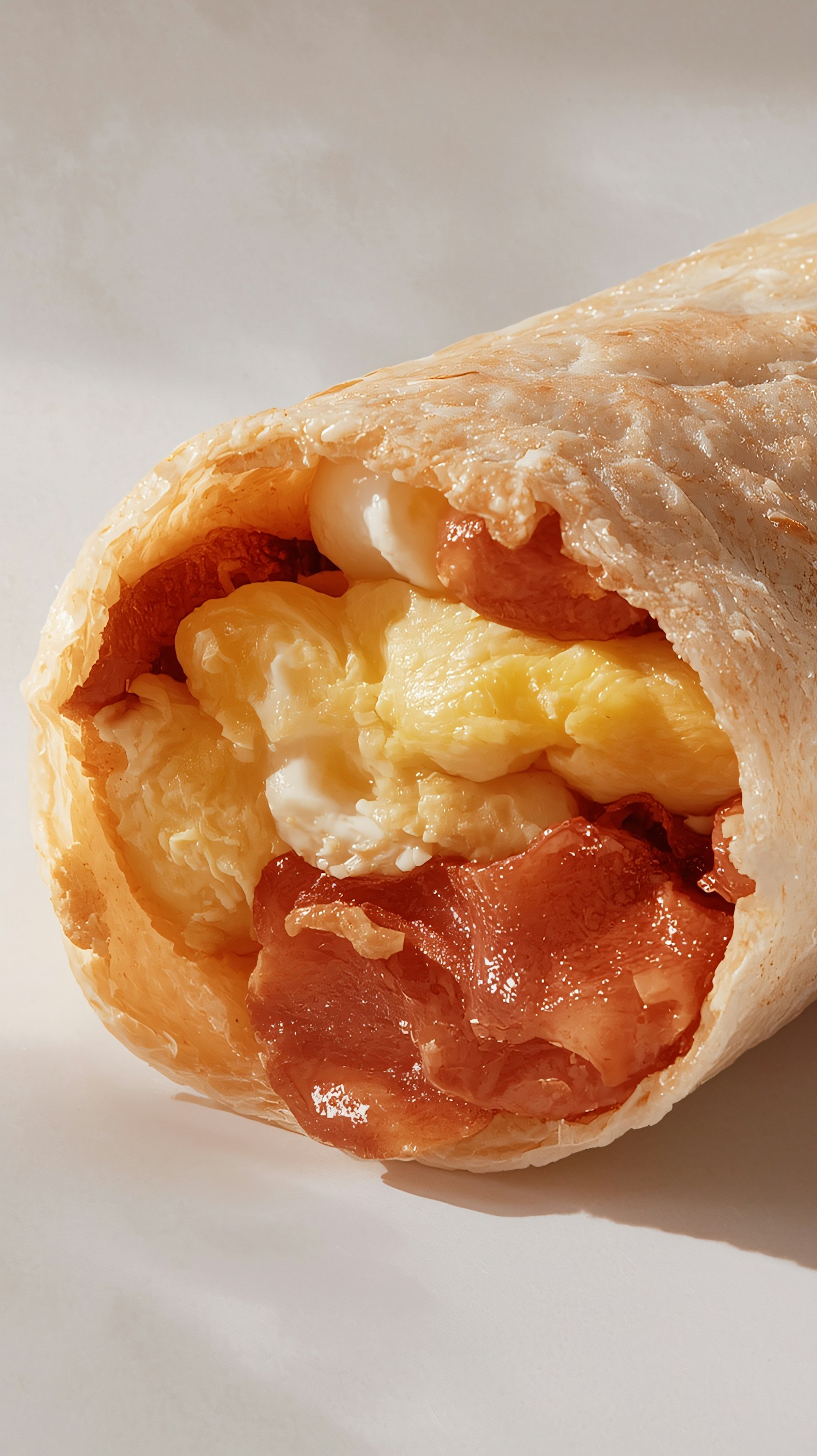 Close-up of a breakfast wrap with scrambled eggs, crispy bacon, and creamy sauce in a golden tortilla, highlighting its textures and colors.