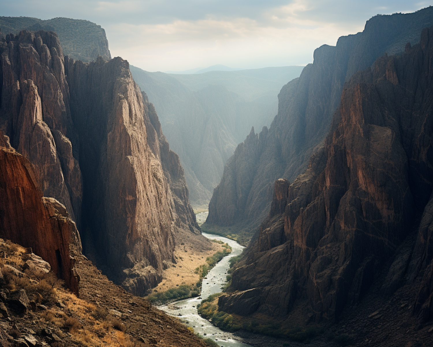 Majestic canyon with towering rock formations and a winding river under a cloudy sky, showcasing earthy tones and sparse greenery.