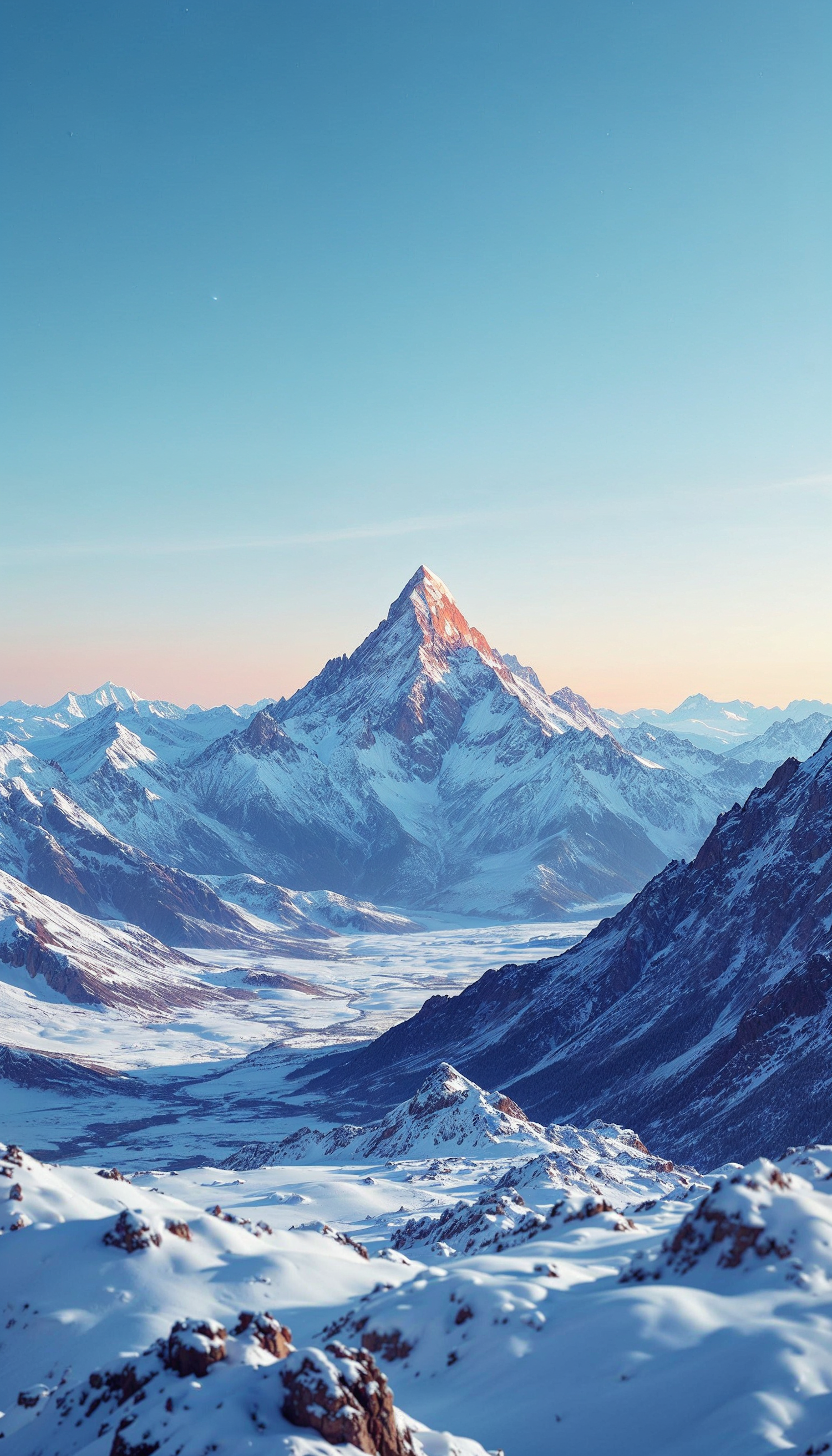 Breathtaking snow-covered mountain range with a prominent peak under a clear blue sky, capturing the serene beauty of nature.