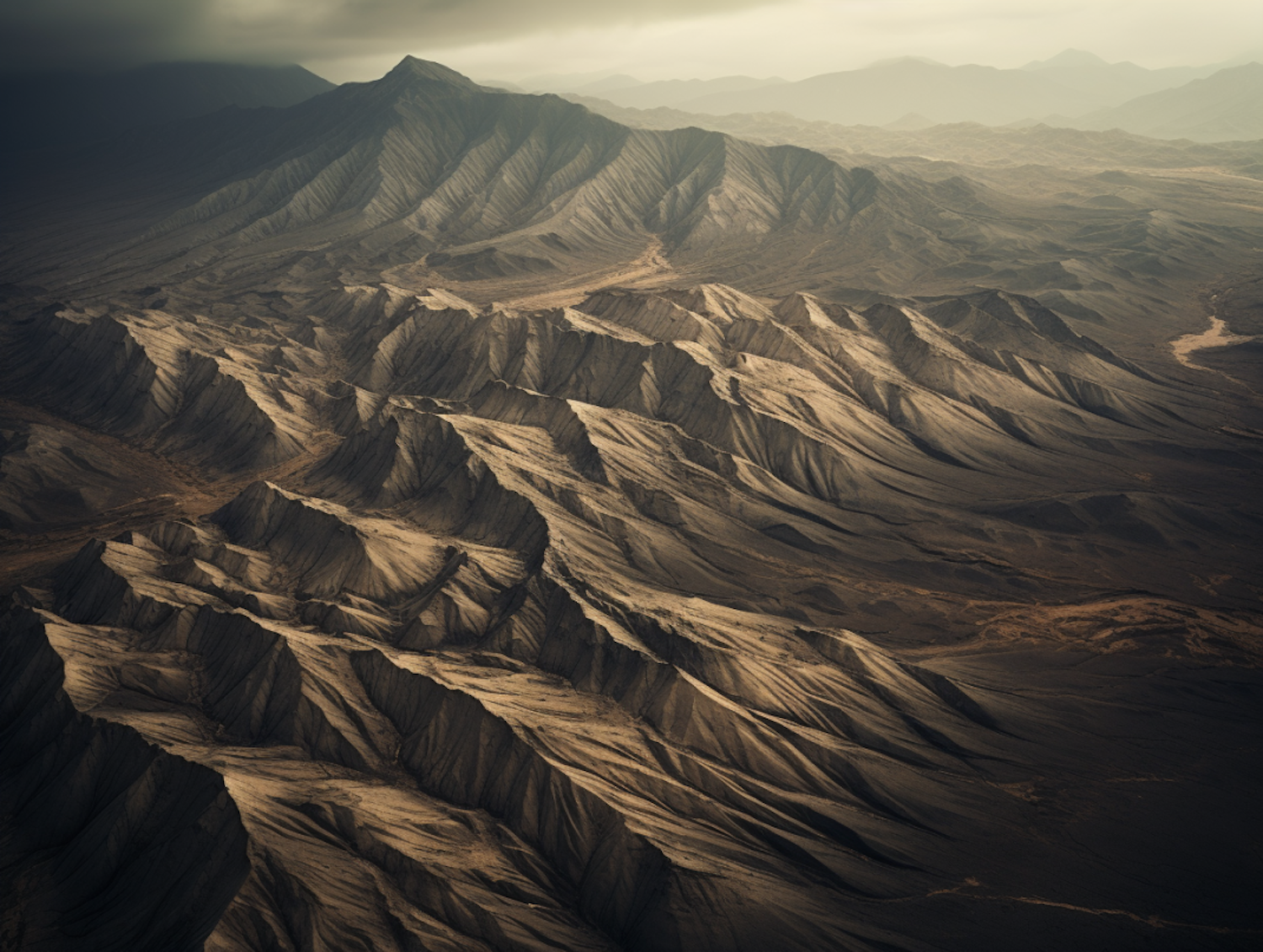 Majestic mountain range with sharp ridges and deep valleys under an overcast sky, creating a dramatic and textured landscape.