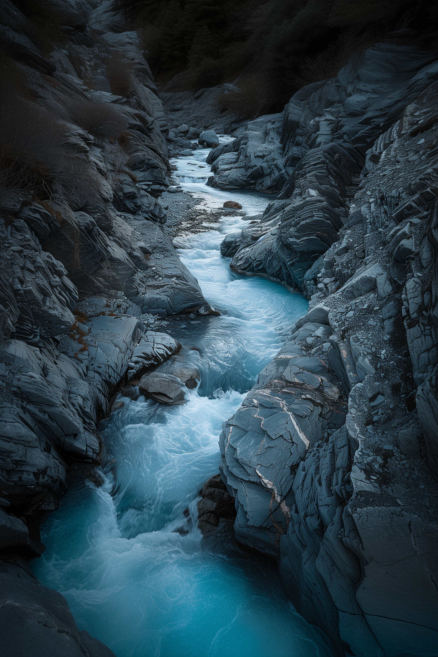 Turquoise river winding through rugged gray cliffs, creating frothy rapids in a stunning natural gorge.