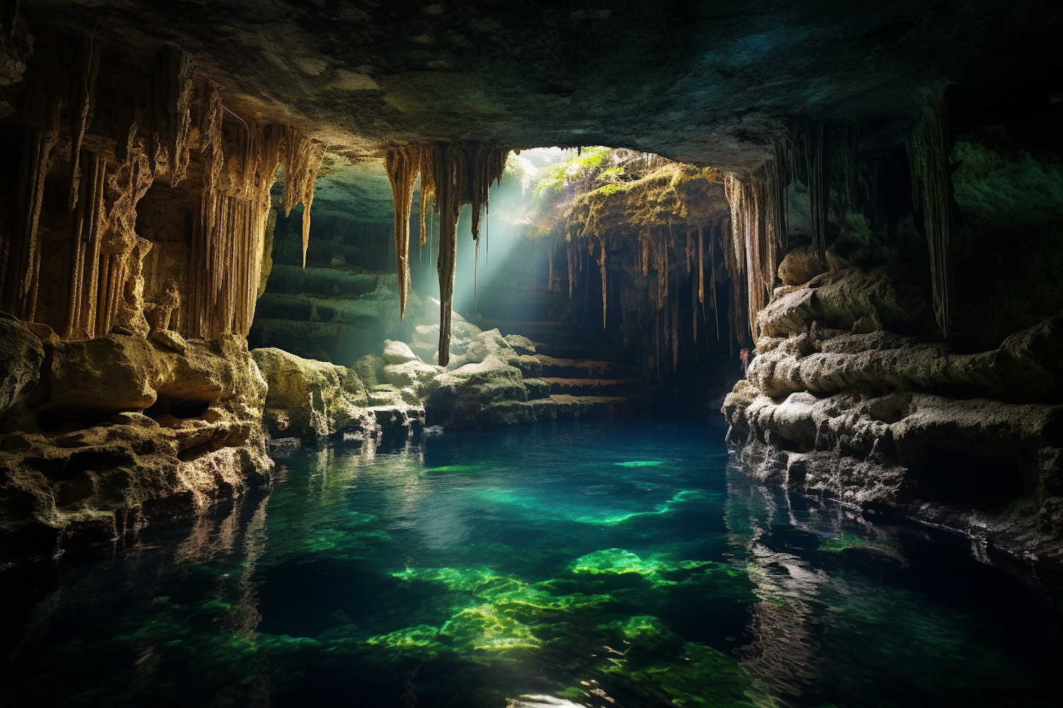 Explore a breathtaking underground cave with crystal-clear waters, stalactites, and enchanting sunlight streaming through.
