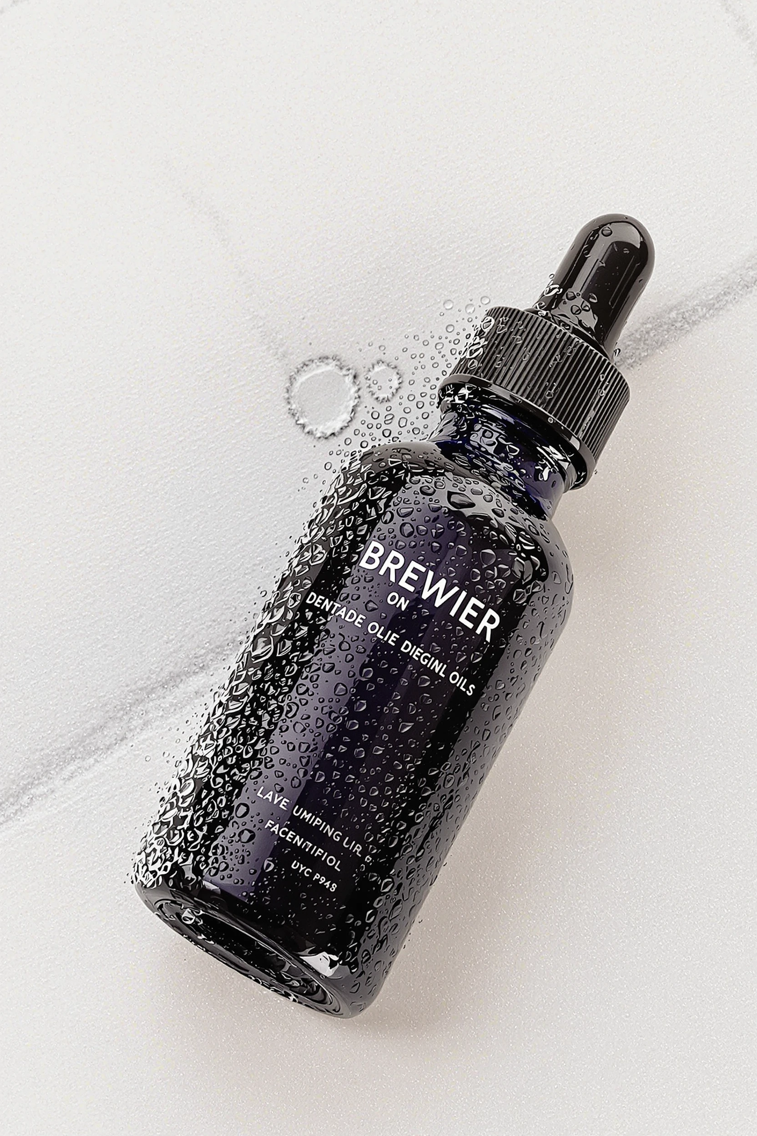 Sleek dark glass dropper bottle with water droplets on a textured white surface, labeled 'BREWIER'.