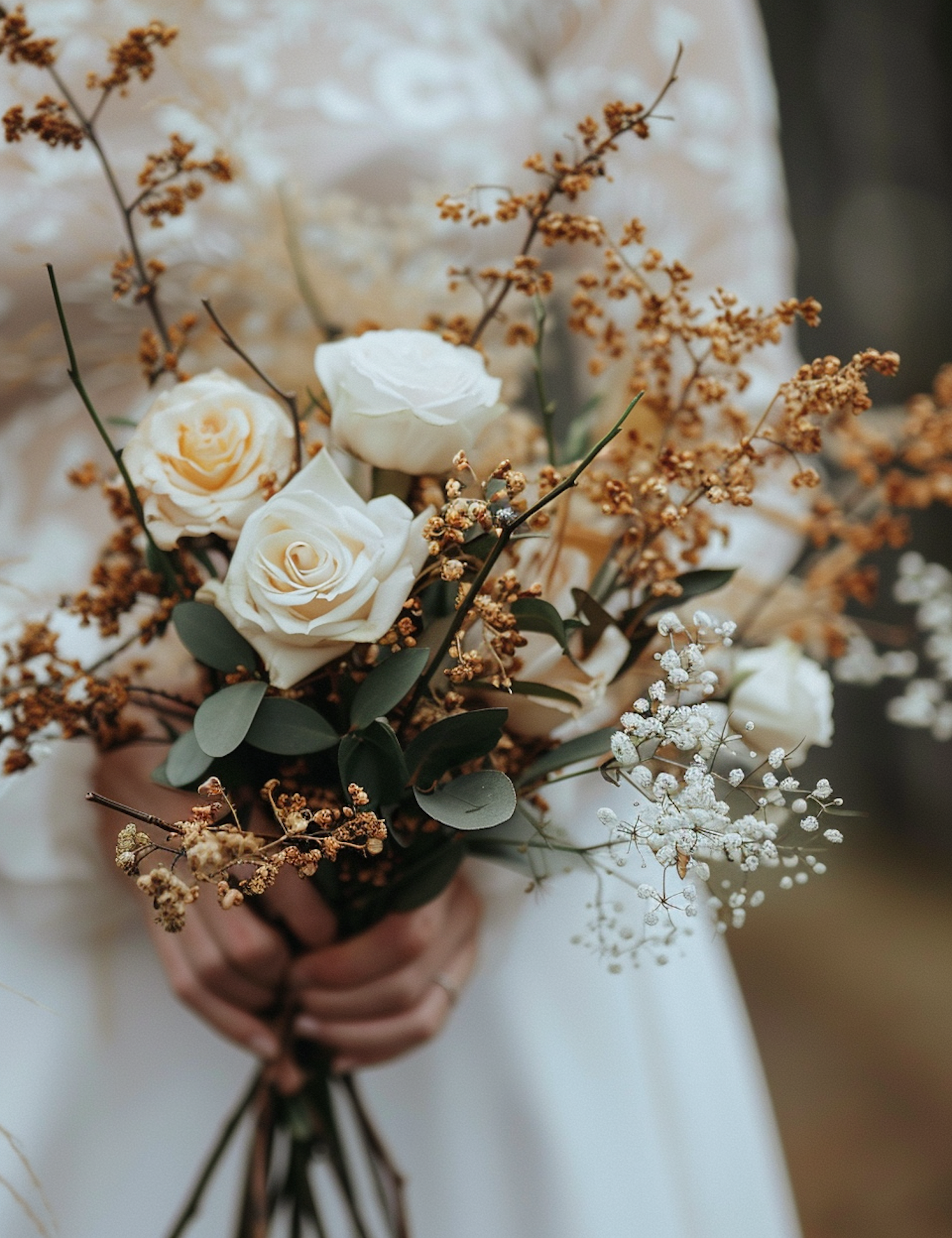Elegant bridal bouquet with white roses, baby's breath, and dried foliage, held by fair-skinned hands with a simple ring.